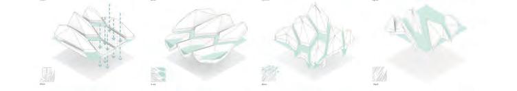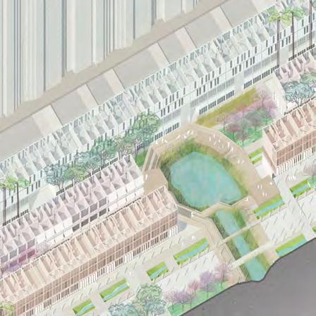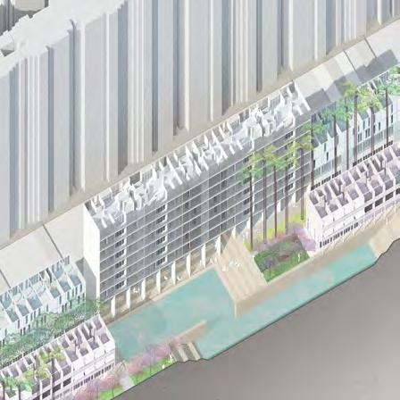 The pilot site was developed in 3 phases. The initial stage establishes a hydrologically performing ground-plane and main bermed path based on the desire lines of water flow and pedestrian movement. This initial ground plane contains landforms that both buffer against storm surge and allow for water to infiltrate the site at certain points.The second phase establishes small scale modular units on the ground floor that will become public retail storefronts. With future predictions of sea-level rise, this public space can become transformed into sacrificial ground for various flood scenarios. The Final phase integrates private development to densify on top of this initial ground floor, first with adapted floorplates and then regularized plates for maximum economic expediency for future developers.