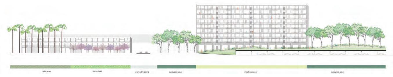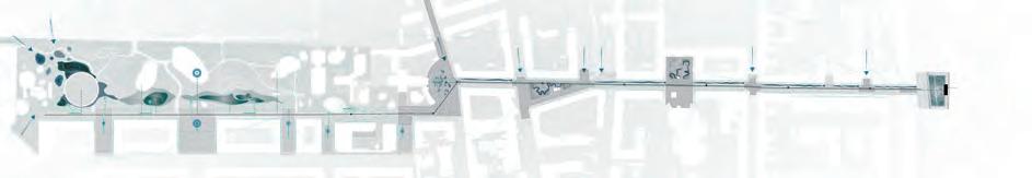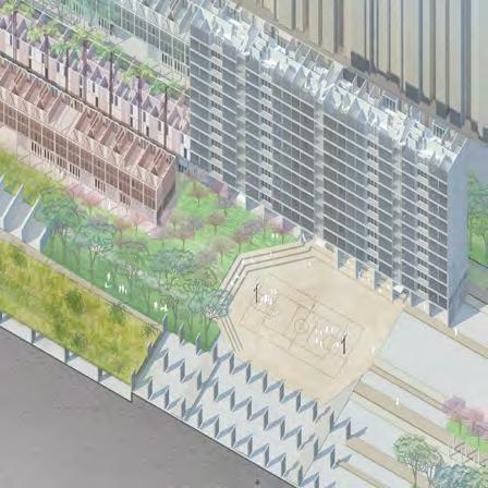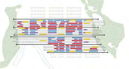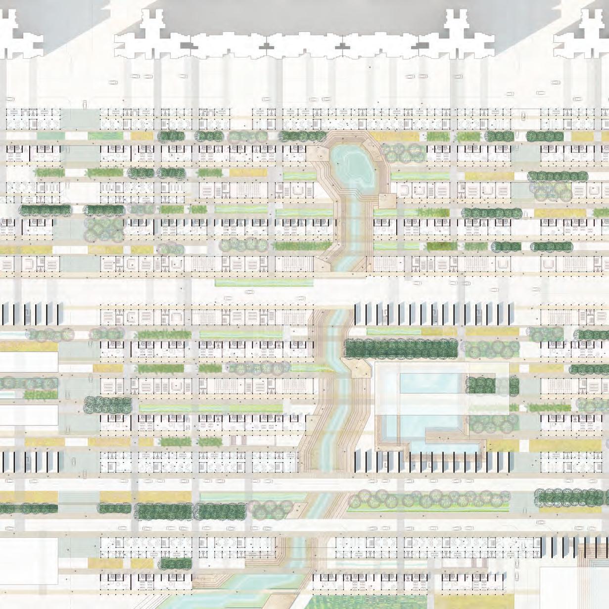 To encourage a new type of knowledge-based live and work urban environment, we are proposing the concept of an urban sieve. This urban sieve’s deep structure functions in a bilateral manner to organize movement. The deep structure that divides the space of economics (the housing units) imprints itself on the ground floor as a flexible, colonnaded corridor. The openness of the ground plane allows people and landscape to filter through. This creates programmatic clarity and continuity in the east-west direction while allowing for a diversity of landscape experiences moving east to west.