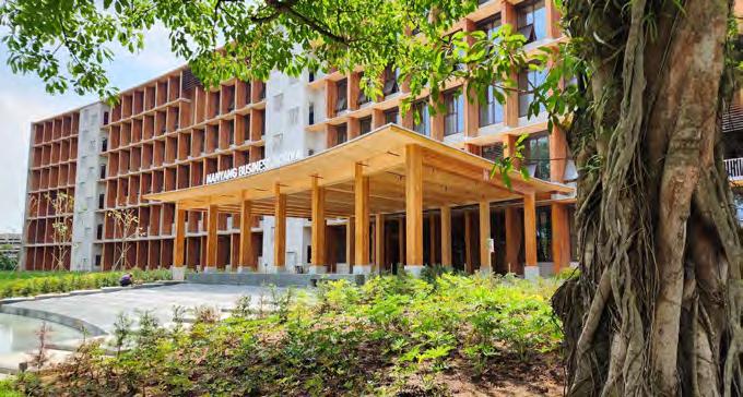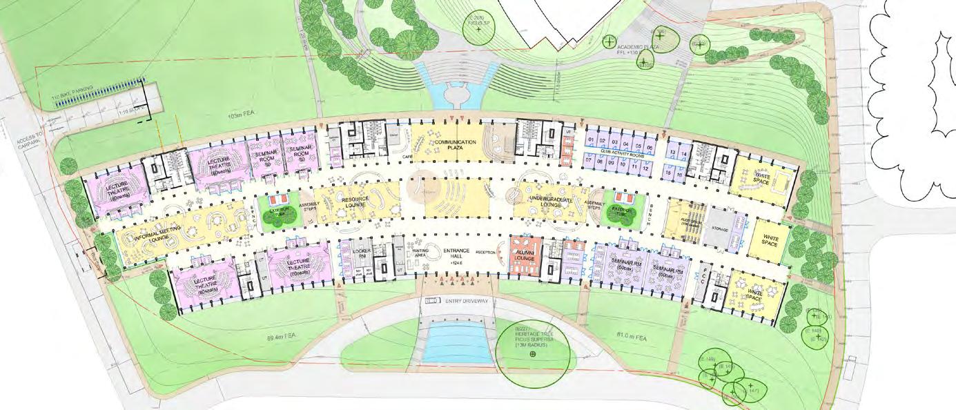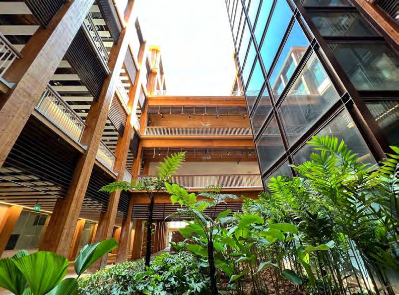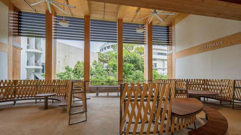 The building structure employs a modular timber post and beam system, its uniform, non-hierarchical deep structure allows program to be flexibly fit within the modules, and also allows for adaptability. This post-and-beam structure extends visibly on the facade as horizontal and vertical fins, reinforcing the timber structure of the building while creating a deep coffered facade, which diffuses exposure to direct sunlight during hot Singapore summers. The entire building is laid on a radius so that its slightly curved form embraces visitors, creating a welcoming gateway to the rest of the campus and the nearby Yunnan Garden.