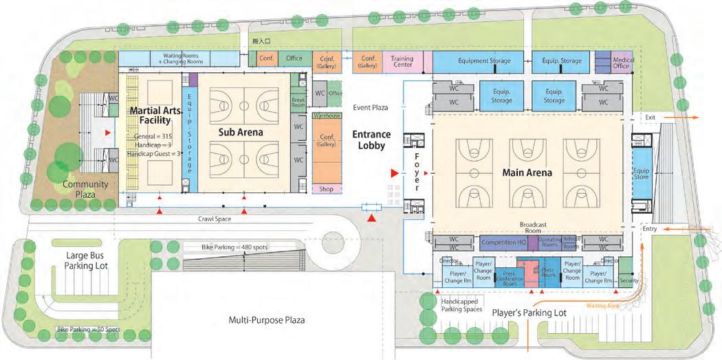 The design of Kagawa Prefectural Gymnasium pays homage to this spirit of tradition to create a sacred and innovative contemporary space for sports by creating new gateways to the city. The site of Takamatsu lies at the interface between land (mountains) and water. We deliberately play upon this intersection, creating gateways for both land and water.