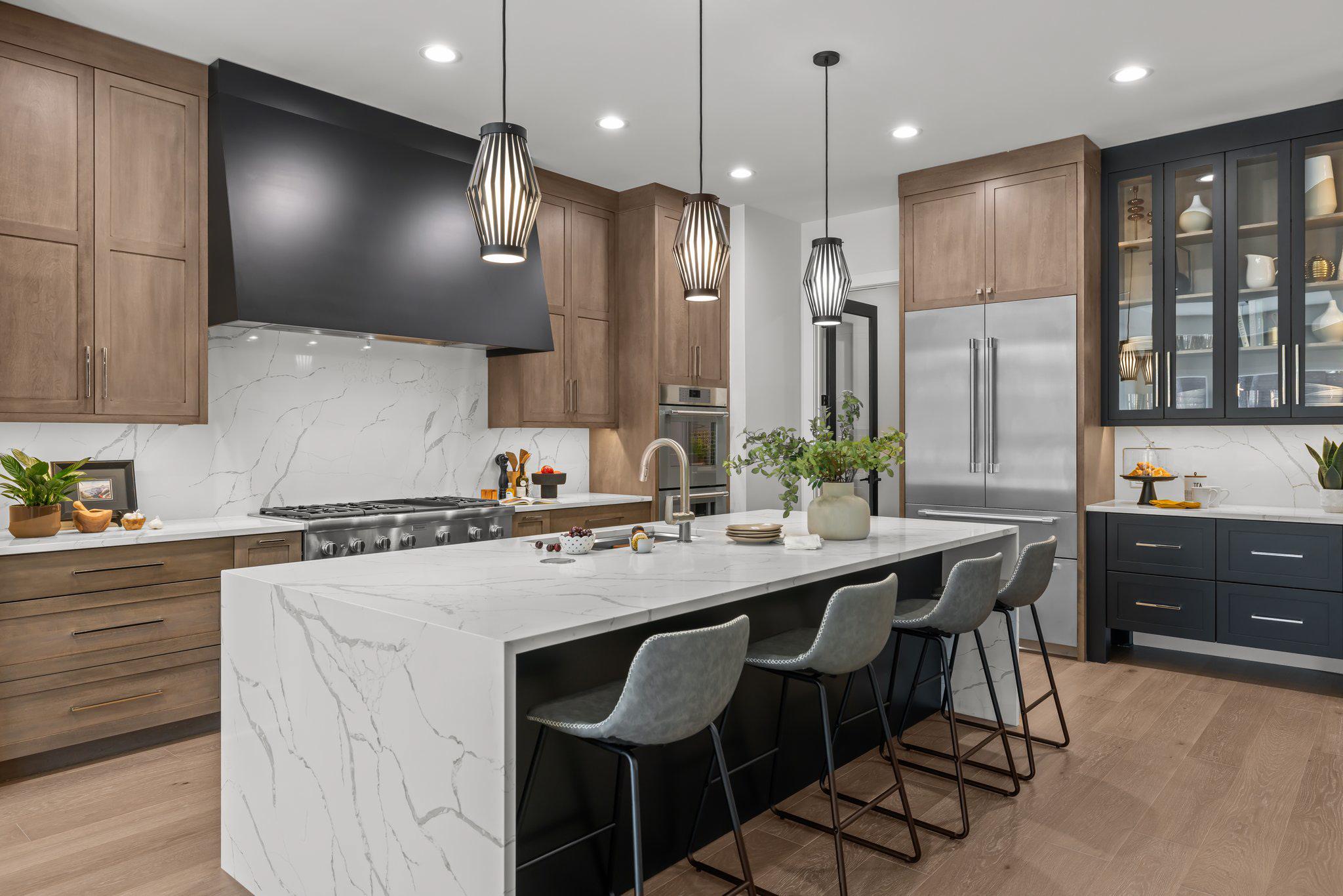 Quartzite countertops & backsplash, stained island w/pendant lights, custom cabinetry, stainless steel appliance package