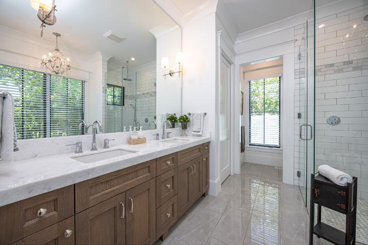 This kitchen features two-tone cabinets, three-tone metals, and a large white-oak island with a porcelain farmhouse sink. The laundry and back kitchen combo provide extra storage. Engineered hardwoods flow throughout, with a steel front door with electrified glass for extra privacy. The bathroom includes a curbless shower, freestanding tub, rain head shower, and custom his-and-hers closets. Large windows, marble countertops, and custom mirrors with integrated sconces create a luxurious, functional space.