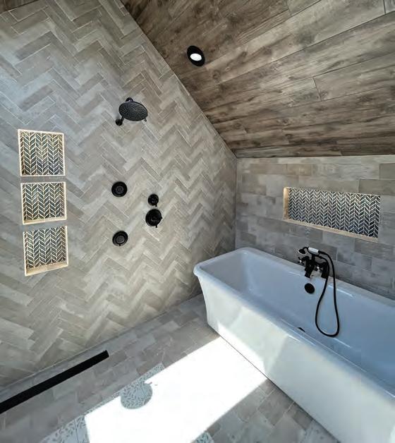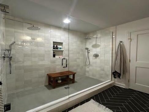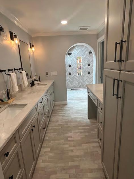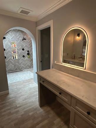 This project was a complete overhaul of the existing layout of the master suite upstairs. The original layout made no sense and we re designed it to incorporate 2 custom (his and hers closets) with one housing a washer/dryer unit. A long vanity room which opens up into a 78 sq foot wet area with two jumbo skylights that has two rain head showers accompanied by 4 total body sprays and freestanding tub. We added led strip lighting in the niches, and heated floor throughout the space and included a heated towel rack for comfort. The whole upstairs was taken down to the studs and we added open cell spray foam insulation to solve a heating and cooling issue the homeowners were experiencing. We also fixed all the existing structural issues we uncovered. We also redid the stair area by using ship lap and white washing it, as well as replacing the stair treads, newel posts, and balusters. A custom faux beam made of ambrosia maple hides an HVAC chase upon entry.