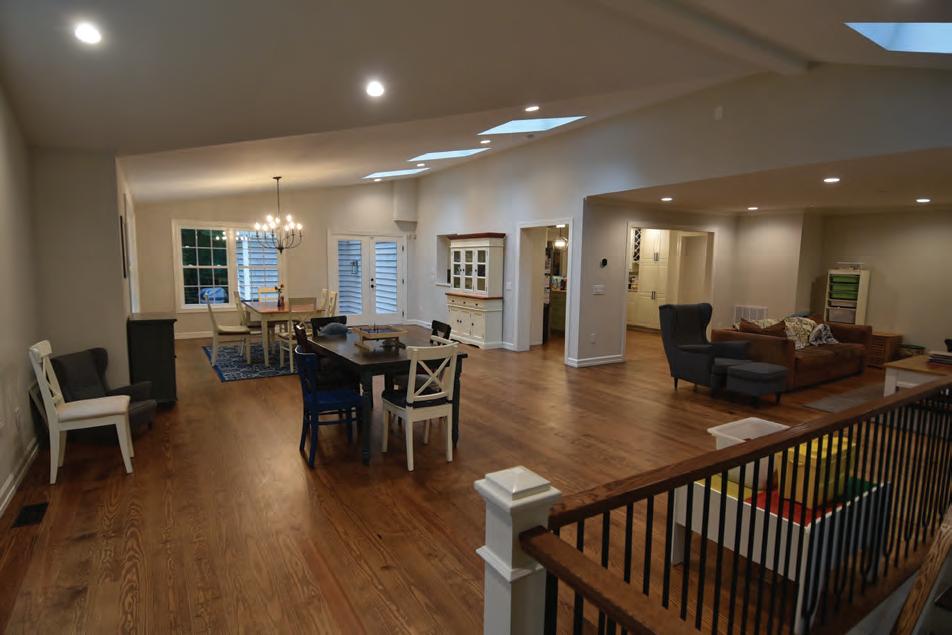 Our homeowners wanted to take their choppy floor plan and make it wide open! The front covered porch had previously been converted into interior space, but the framing was never updated properly. We had to do some serious structural framing work to bring it up to code. Then, we removed the wall between this space and the