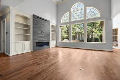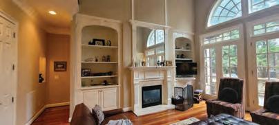 • Open concept family room offers cove crown molding, custom trim surround fireplace w/ flanking built-in cabinets & shelving & large sliders to vaulted covered porch w/ stone surround fireplace!