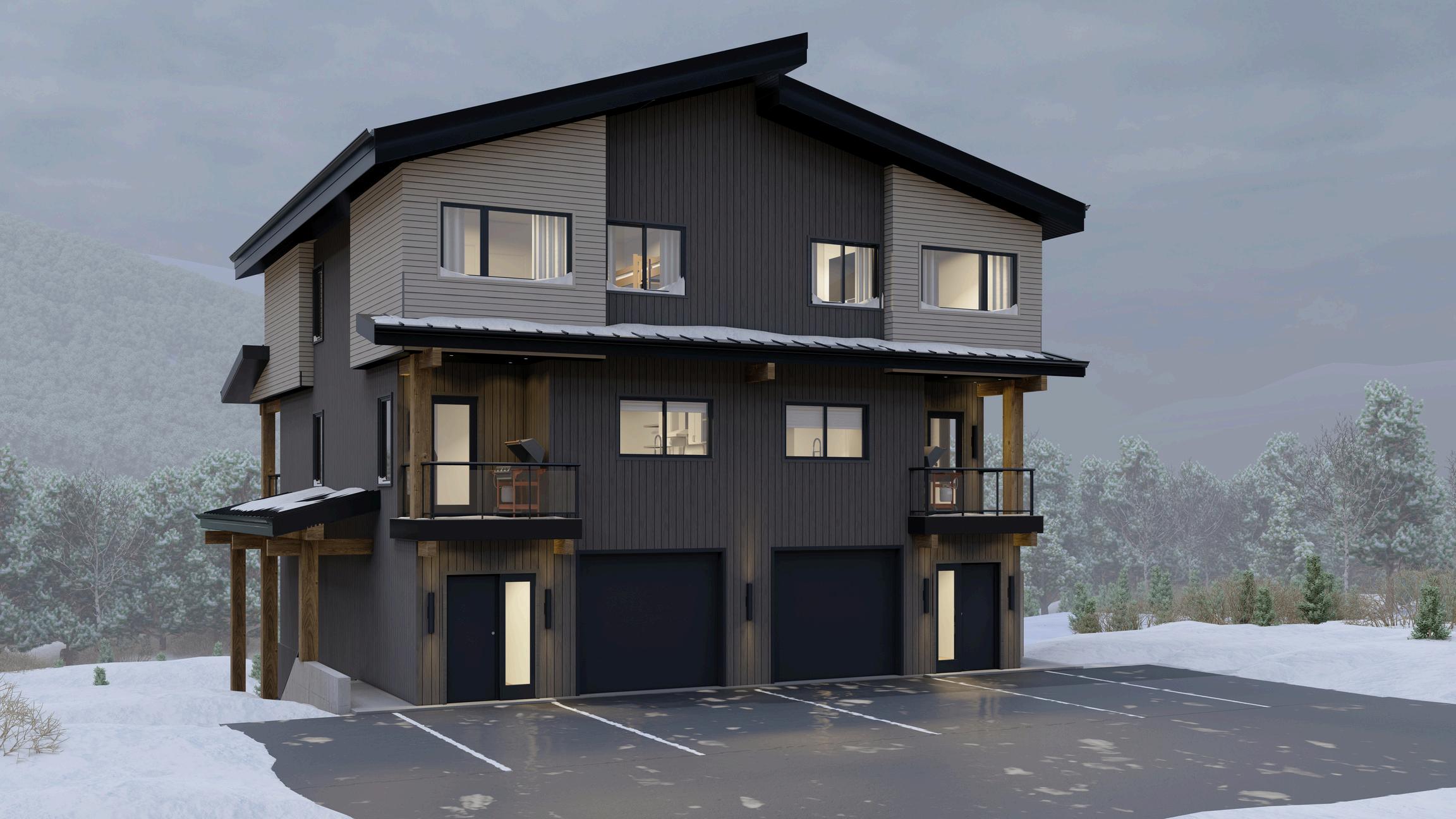 This project consisted of a duplex with two basement suites. The goal was to provide multiple dwelling units at Apex mountain that prioritize comfort and warmth at a very cold location As it is a growing tourist destination, this building will provide the perfect vacation stay for a travelling couple or a cozy weekend getaway for a large family. The architectural style features natural materials like timber beams and columns, wood siding, and large windows to connect with nature.