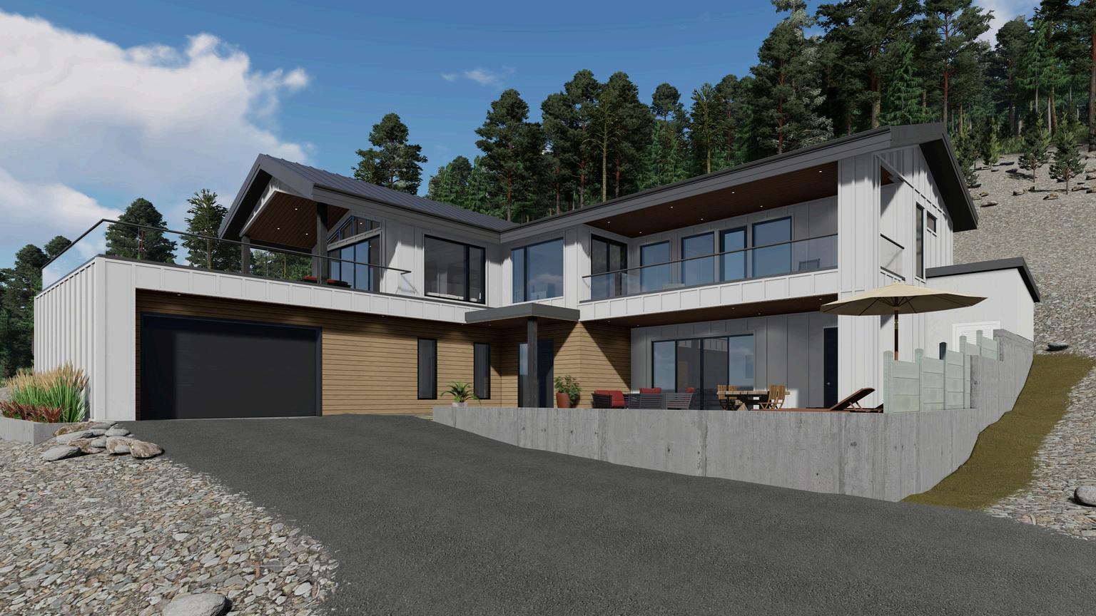 Perched elegantly on a steep lot in beautiful Naramata BC, this modern house captivates with its sleek, angular design and expansive windows framing unparalleled vistas of the Okanagan valley.