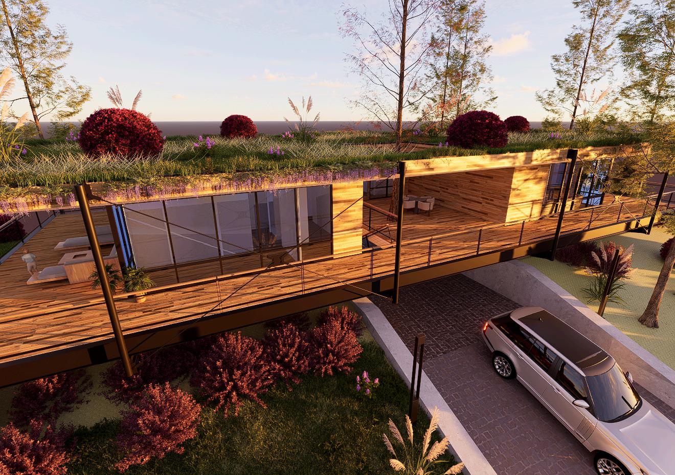 Casa NAO: es una mansión moderna que abraza l:a naturaleza como parte esencial de su diseño. Su arquitectura se levanta con amplias estructuras de vigas de hierro y detalles de madera cálida, creando un contraste elegante y atemporal. El techo verde, cubierto de césped y diversas especies vegetales, se integra de manera orgánica con el paisaje, favoreciendo el aislamiento térmico y la sostenibilidad. Grandes ventanales conectan interior y exterior, permitiendo que la vegetación