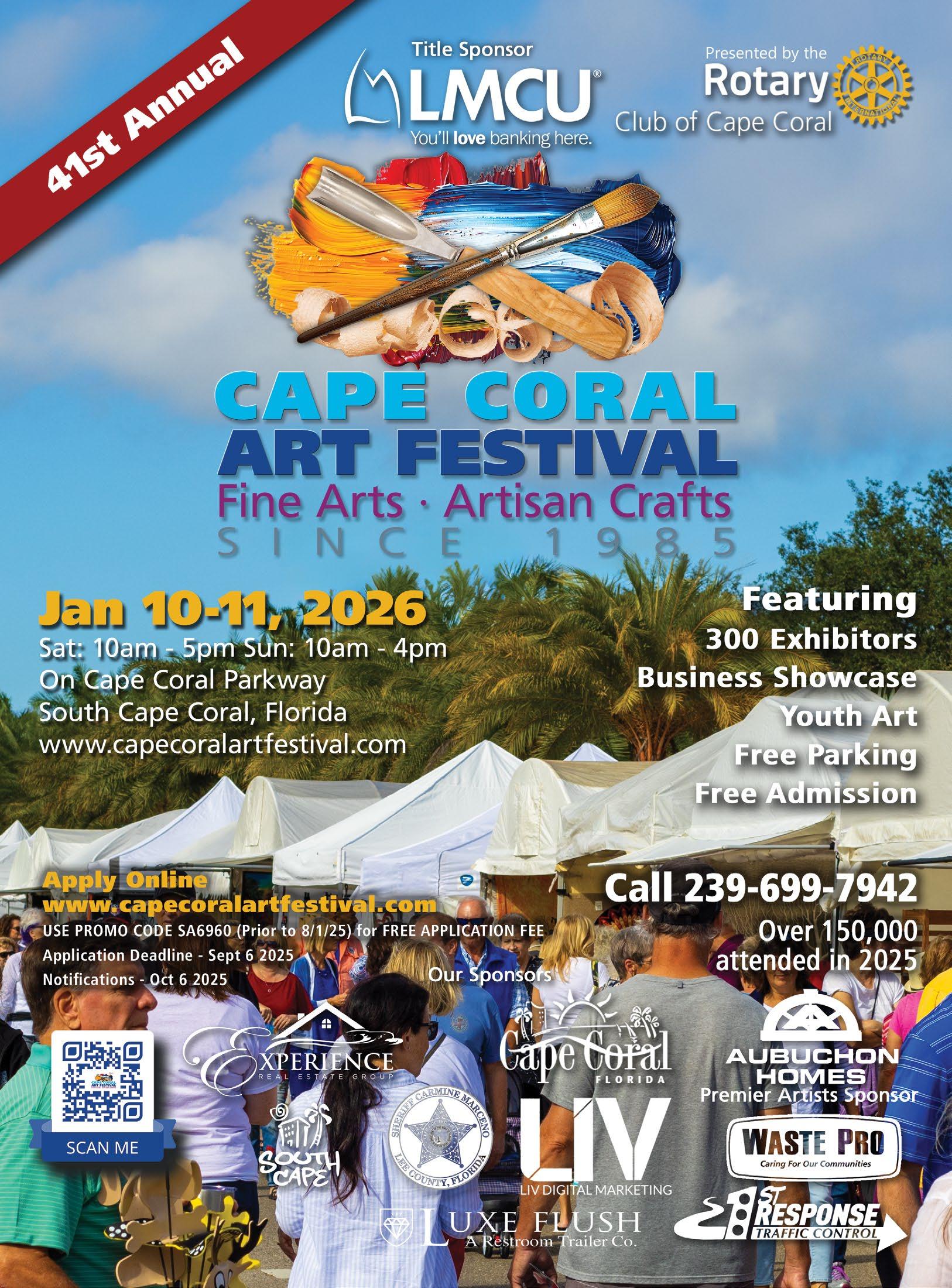 41st Cape Coral Art Festival Cape Coral Parkway between Del Prado Boulevard and Coronado Parkway. Deadline: 9/6/2025. Notification: 10/6/2025. App. fee: $35. Space fees: $450 to $900. Space sizes: 11x10 to 22x10. Est. public attendance: 150,000 (source: police, random headcounts, television news). $10,000 in awards. Special purchase program. 40 yrs. at this site. 250 exhibitor spaces. 100% outdoor.