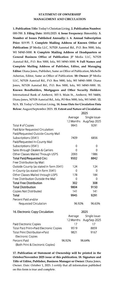 Today’sChristianLiving(ISSN 1944-6330) is published bimonthly by JP Media LLC, N7528 Aanstad Rd., P.O. Box 5000, Iola, WI 54945. Periodicals Postage Paid at Iola, WI 54945 and at additional mailing offices. Copyright © 2025 by JP Media LLC All rights reserved. Reprint permission must be granted in writing. Publisher assumes no responsibility for claims made in advertisements. Manuscript submissions are welcome but JP Media LLC assumes no responsibility for loss or damage thereto. Material accepted for publication is subject to such revision to meet the requirements of this publication and become the property of Today’sChristianLiving Subscription $19.95 per year. Single copy price $4.95 each. POSTMASTER: Send address changes to Today’sChristianLiving , P.O. Box 8551, Big Sandy, TX 75755-9766. Subscription problems and inquiries should be directed to (800) 223-3161.