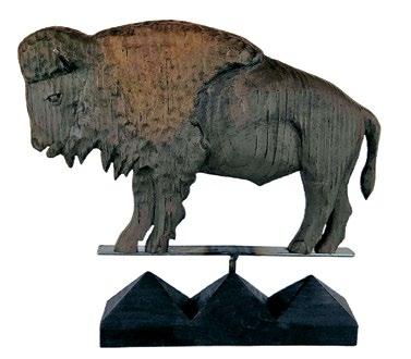 The weather vane is carved by hand from sustainably harvested and locally sourced Atlantic white cedar. Comes on a custom fabricated steel mount with carved mountains. Has upcycled horseshoe horns. 13" l. x 12" h. x 2" d.