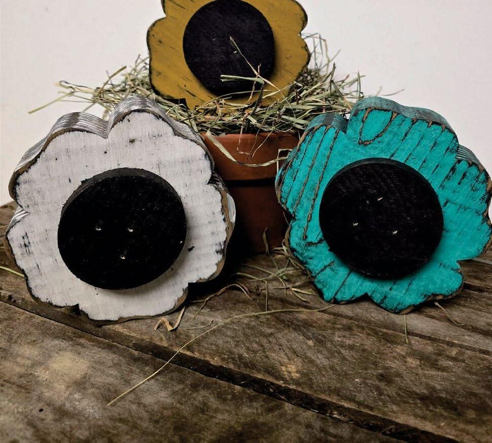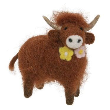 The udderly moo-velous cow has a soft brown body, long cream horns, and a fluffy tuft of hair on her head. Accented with a necklace made of two felt daisies. Can display freestanding on a flat surface or hang.