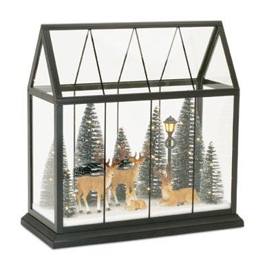 An elegant 13" h. greenhouse contains a herd of deer standing on snow in front of lighted evergreen trees and a glowing streetlamp. Made of glass and plastic. Two AA batteries not included.