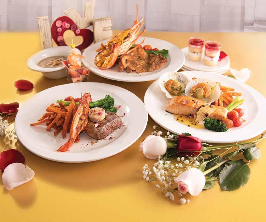 LOVE ME TENDER SET MENU Available on 13 Feb (Dinner) & 14 Feb (Lunch & Dinner) $43.80 per pax Appetiser | Prawn & Fruits Salad Soup | Truffle Mushroom Soup Choice of a Main Course Cheese-baked Half Lobster & Lemon Herb Chicken Salmon with Passionfruit Marmalade & Garlic Butter Half Shell Scallops N.Z. Tenderloin Steak with Berries Butter & Grilled Prawn Main Course are served with Sweet Potato Fries and Seasonal Vegetable Valentine's Dessert