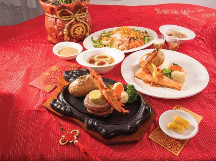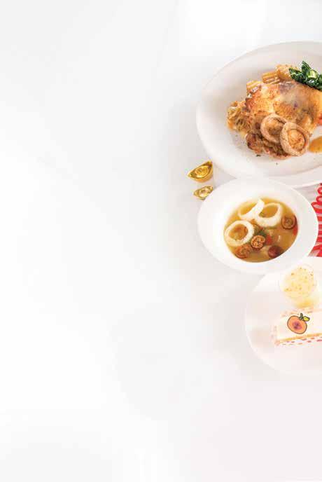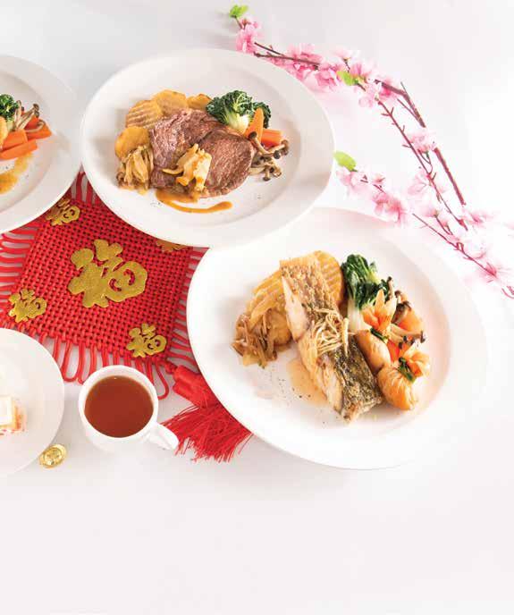 BOUNTIFUL SET DINNER FOR TWO Available from 16 to 29 Jan 2023 $78.80 for 2 pax To Share Harvest Toss Seafood Salad Individual Fish Maw & White Fungus Chicken Broth Main Course Bacon-wrapped Fillet Mignon with Truffle Butter & Tiger Prawn and Grilled Salmon with Tiger Prawn Main Course are served with Signature Baked Potato and Seasonal Vegetables Sweet Ending Joyful Jelly & Pineapple Tarts ABUNDANCE SET LUNCH Available from 16 to 29 Jan 2023 $24.80 per pax Soup Fish Maw & White Fungus Chicken Broth Choice of a Main Course N.Z. Ribeye Steak with Abalone Sauce and Sliced Abalone Barramundi Fillet with Ginger Plum Sauce and Golden Money Bag Dumpling Chicken with Pineapple Marmalade and Yam Basket with Scallop Main Course are served with Lyonnaise Potato and Seasonal Vegetables Sweet Ending Lunar New Year Dessert Coffee / Tea Make Your Reservations TODAY! www.jppepperdine.com/reservations 13