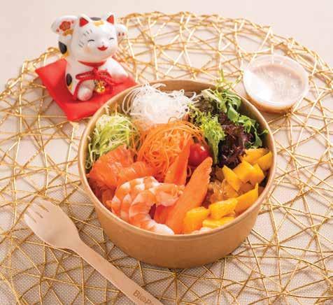 Smoked salmon, prawn, snow crab leg, refreshing fruits, mesclun greens, on fragrant rice. Accompanied with sesame dressing to provide you the perfect mix to toss and enjoy.
