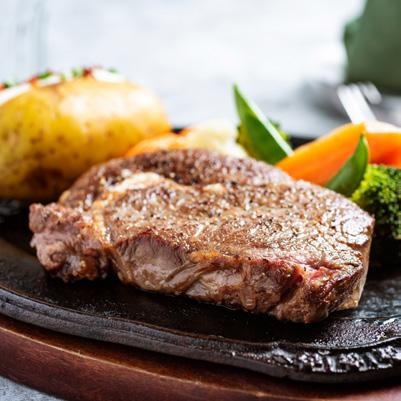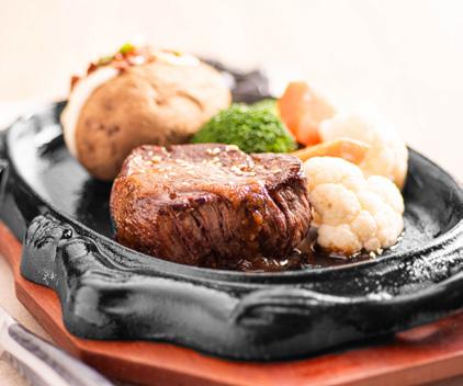 A platter filled with perfectly grilled N.Z. Tenderloin, Ribeye and Striploin steaks. Complemented with Signature baked potatoes, seasonal vegetables, pickled tomatoes, and Bulgogi & Brown Sauce.