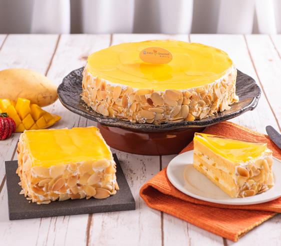 Signature mango mousse cake layered with soft vanilla sponge, topped with fresh mango slices & decorated with almond flakes for an elegant touch.