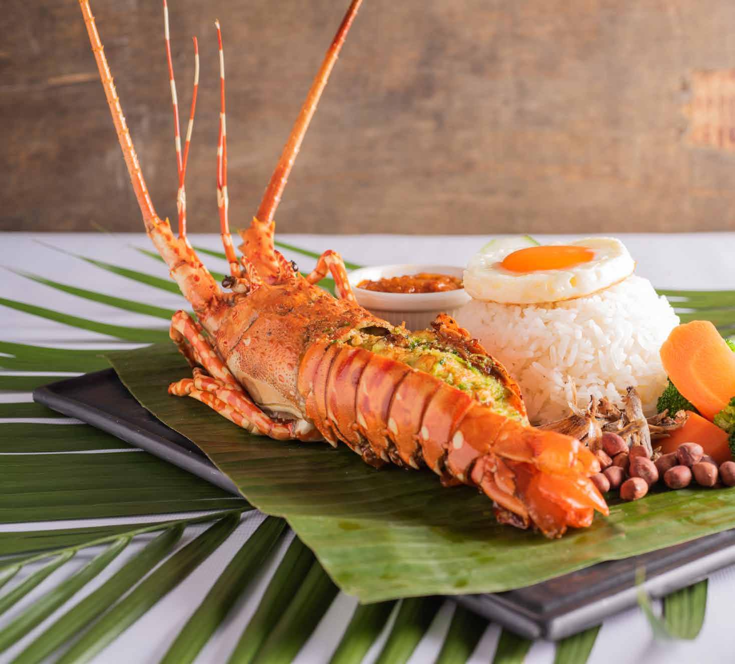 Grilled garlic butter lobster (±500g), fragrant coconut rice, ikan bilis, peanuts, fried egg, seasonal vegetables & homemade sambal