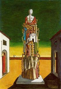 喬治.德.基里訶實踐「形而上」哲學,創立形而上畫派。他曾 說:「形而上的藝術,表面上十分寧靜,但給人的感覺卻像是在寧靜 中會有什麼事情要發生。」對他來說,可見的事物為「形」,只有透 過敏銳觀察才能感知「形上」,經由藝術的探詢,才能發現事物的內 在深度。 本次挑選的七件作品有個共通點:明亮鮮豔的景色中,物體 銳利的框線和色塊的對比,割傷了和諧與寧靜,令人總感覺有什麼在 蠢蠢欲動。