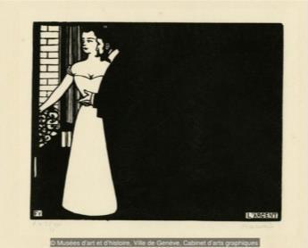 所定義。例如,本次展覽的一件作品《拜訪》(The Visit,1899年) 中所呈現的。這個場景乍看似乎無傷大雅,甚至有些溫柔:一對打扮 得十分時髦的男女,緊緊地抱在一起,彷彿在重溫曾經在舞會上所享 受過的浪漫擁抱。但是,再靠近一點看,這個女人脖子僵硬,肩膀緊 繃並在往後轉。她很緊張,很害怕,她的左手並不是很情願地與男人 的右手緊握在一起,而是被他所握住。他們模糊的影子在不斷向右擴 散,吞噬了一個書架,此刻房間就像一個籠子。