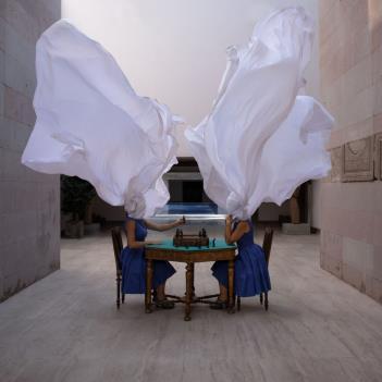 而在《Once I Fell In Time》系列裡,空間和時間在她超現實的構 圖裡變得更加魔幻。無風無浪的環境裡,高掛在孤枝的衣衫可以靜止 在飄動的某刻、被巨大床單矇住臉孔的兩人也能平靜對弈。 攝影師 May Parlar 拍下看似聚合卻又離散的集體孤獨。許多作品 蒙蔽了人物臉、表情,同時特別強調在現代文明社會中,各種不和諧 的孤寂處境。她嘗試透過影像合成,呈現超現實的畫面,藉此談談人 類歸屬與疏離之間的關係與矛盾。基於現實卻又不合邏輯,彷彿是迴 盪在時間片段裡的一場夢境,是 May 對於「存在」的反問。