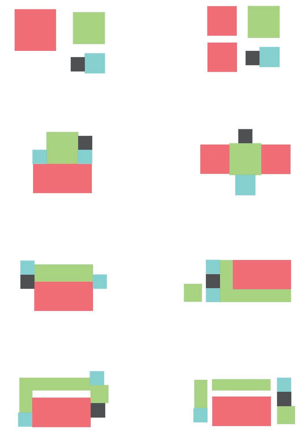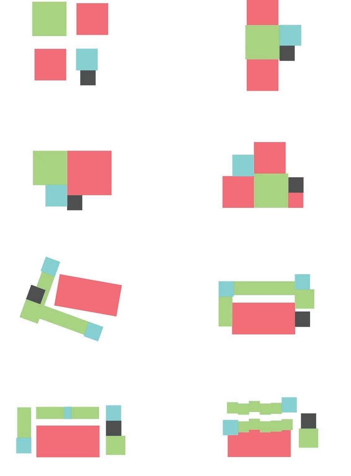 is the iterative sequence that led us to the design we thought was best. Each iteration offers its own set of unique characteristics. Some iterations offer complete separation from other programmatic zones, some divide the zones in half, and others wrap around others. Soon enough, we saw the bigger picture