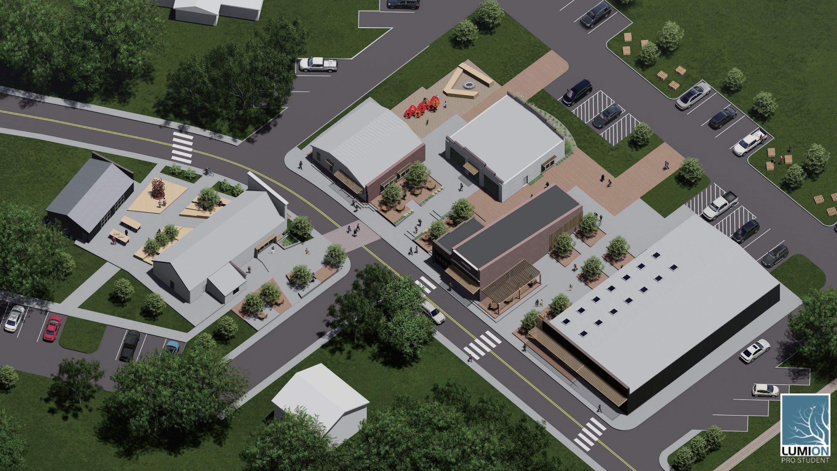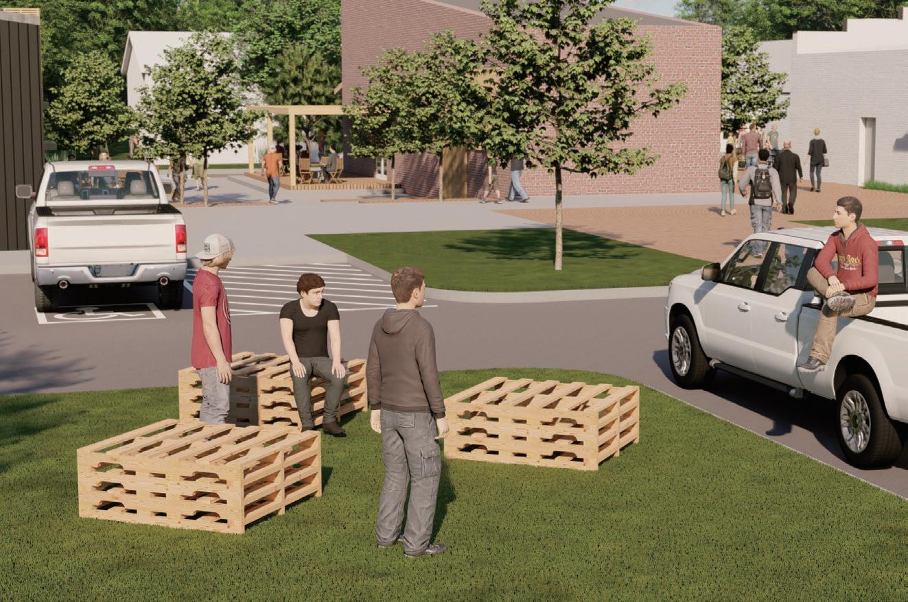 One of the larger issues I faced while growing up in a small rural town was access to public space. There was no dedicated public space for kids of any age to gather safely whenever they desired. My generation was left to illegally tailgate in public parking lots or gas stations due to this issue. Looking to combat this, space has been made all over the project to gather. Yes, even the parking lots. While taking into account the significance and culture of teenagers hanging out with their vehicles, I have implemented the idea of social parking. This idea provides space for all ages to gather and hangout while even customizing their desired space to their liking.