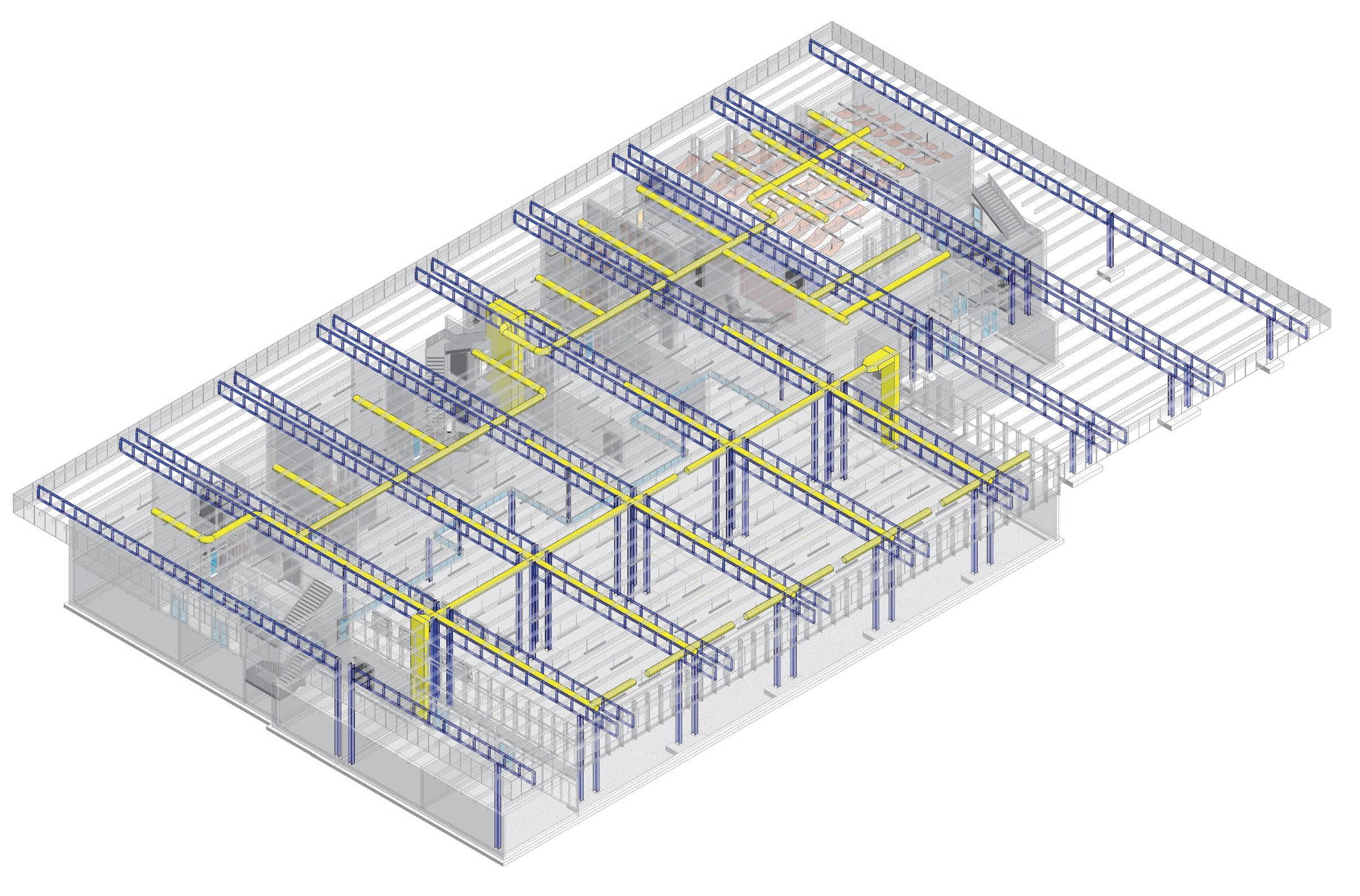 Shown above is an image that highlights the integration of the structural trusses and the HVAC ducts.