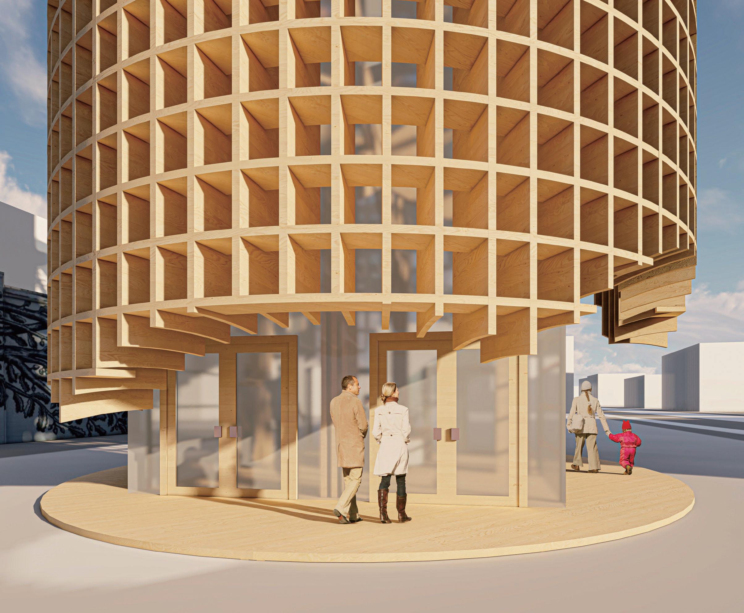 facade gives off the impression as if the structure was floating. This base allowed this appearance to happen while still utilizing the efficiency and structural stability of the cross-laminated timber.