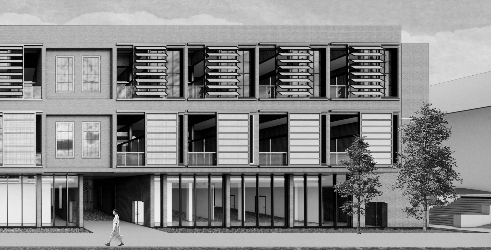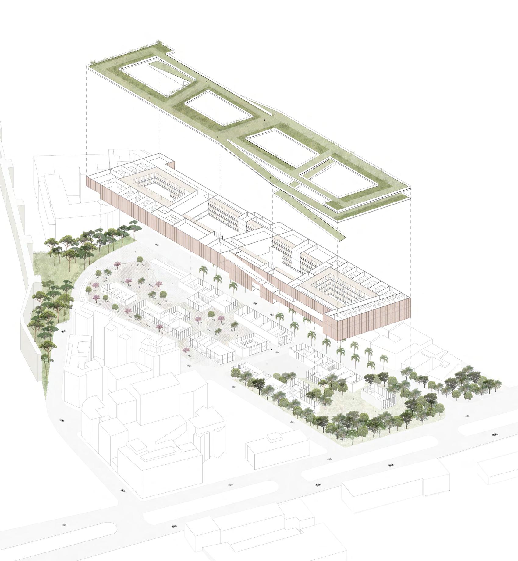 The ground floor houses both enclosed and open studios for patients to conduct various creative activities, with a gallery space to hang up their works of art. A cafe is included that caters to the clients and general public. Throughout the site, a large farmers market flowed along the park. Integrating an indoor/outdoor space for market stalls was important to preserve the existing activity, and allows for patients to experience an invigorating atmosphere.
