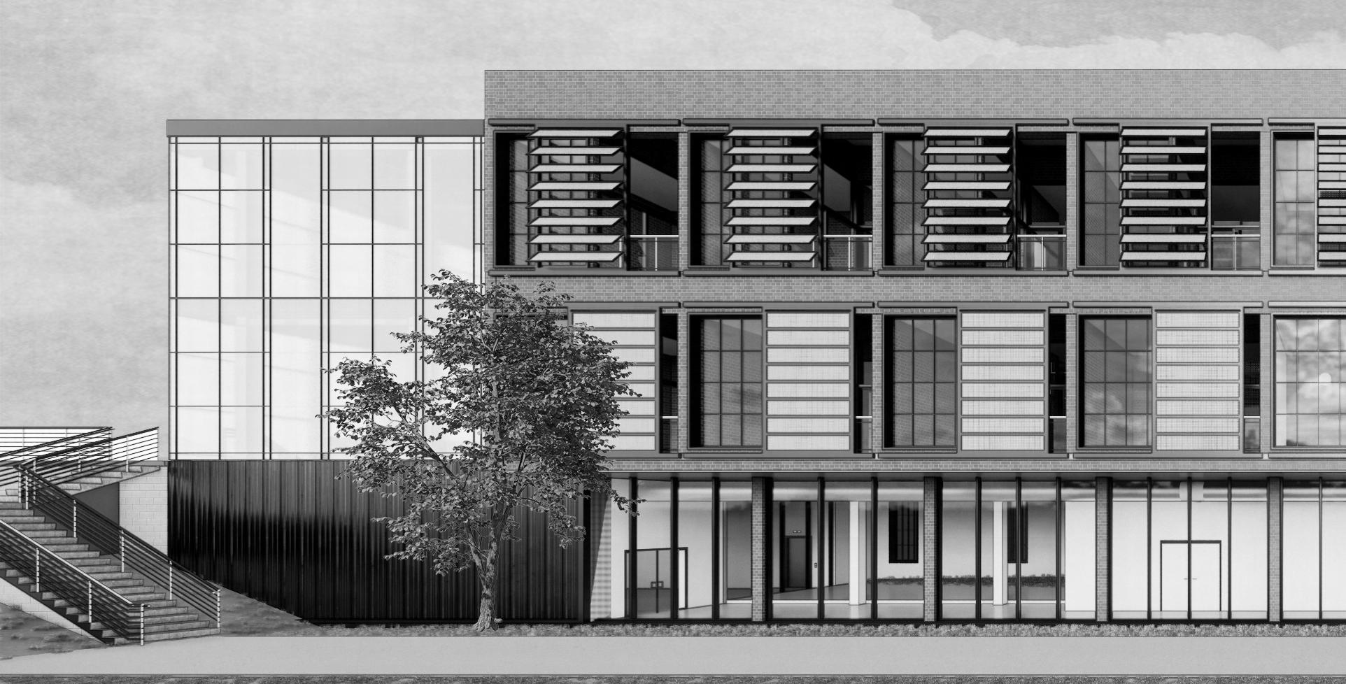 Using a mass timber system, the building is comprised around a grid of 20x20 bays. Three load-bearing solar chimneys are included, and act as a passive cooling element.