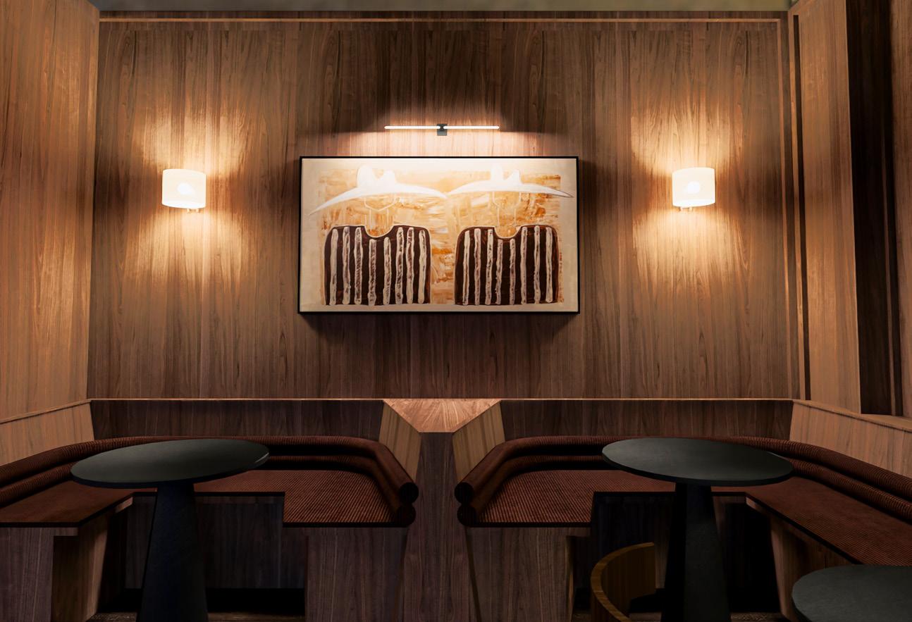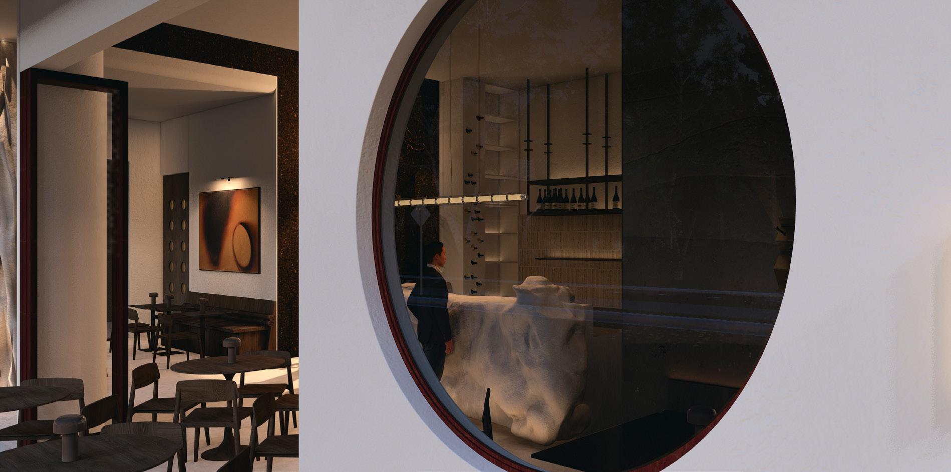 This view highlights the layered materiality within the space. A custom sculptural pendant introduces an organic focal point, complementing the warm cork alcove and guiding the transition toward the main bar area. The circular window detail adds rhythm and reinforces the crafted character of the interior.