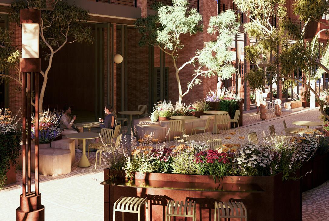 The social centre of the laneway, shaped for eating, drinking and casual interaction. This zone accommodates the bar opening, communal tables and flexible seating arrangements that allow people to gather and share the space.