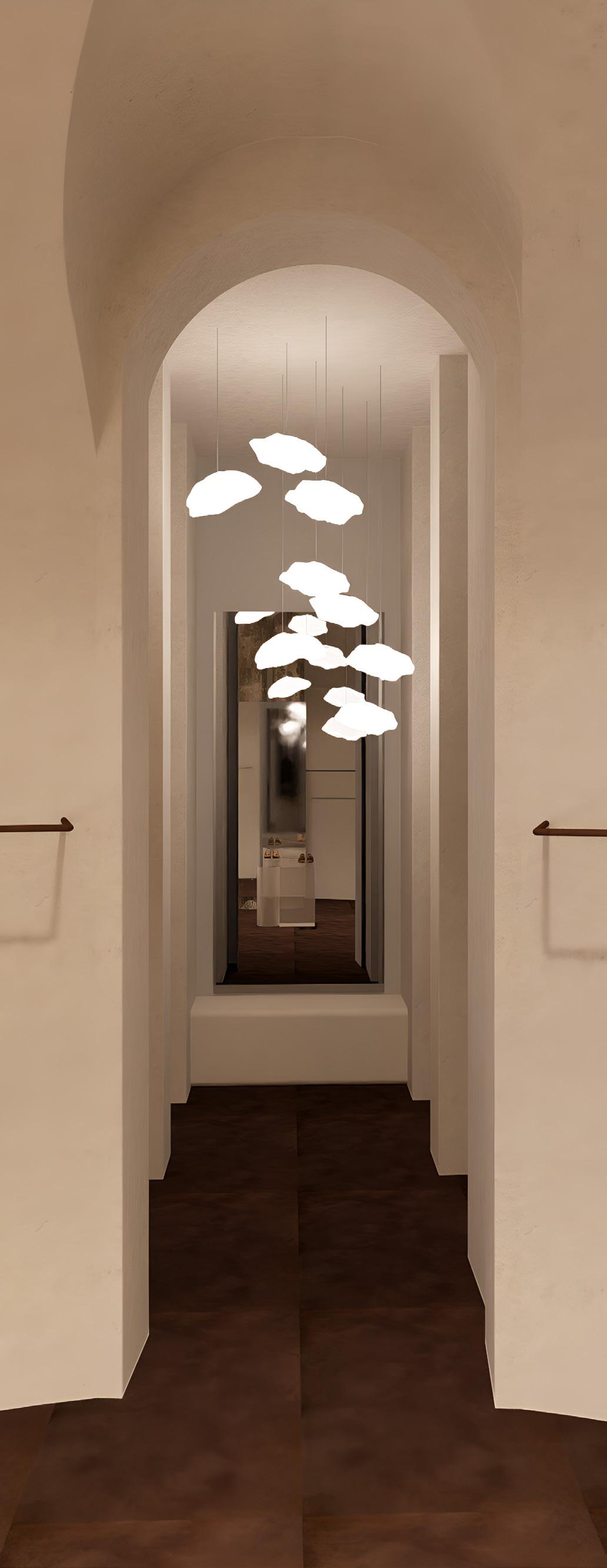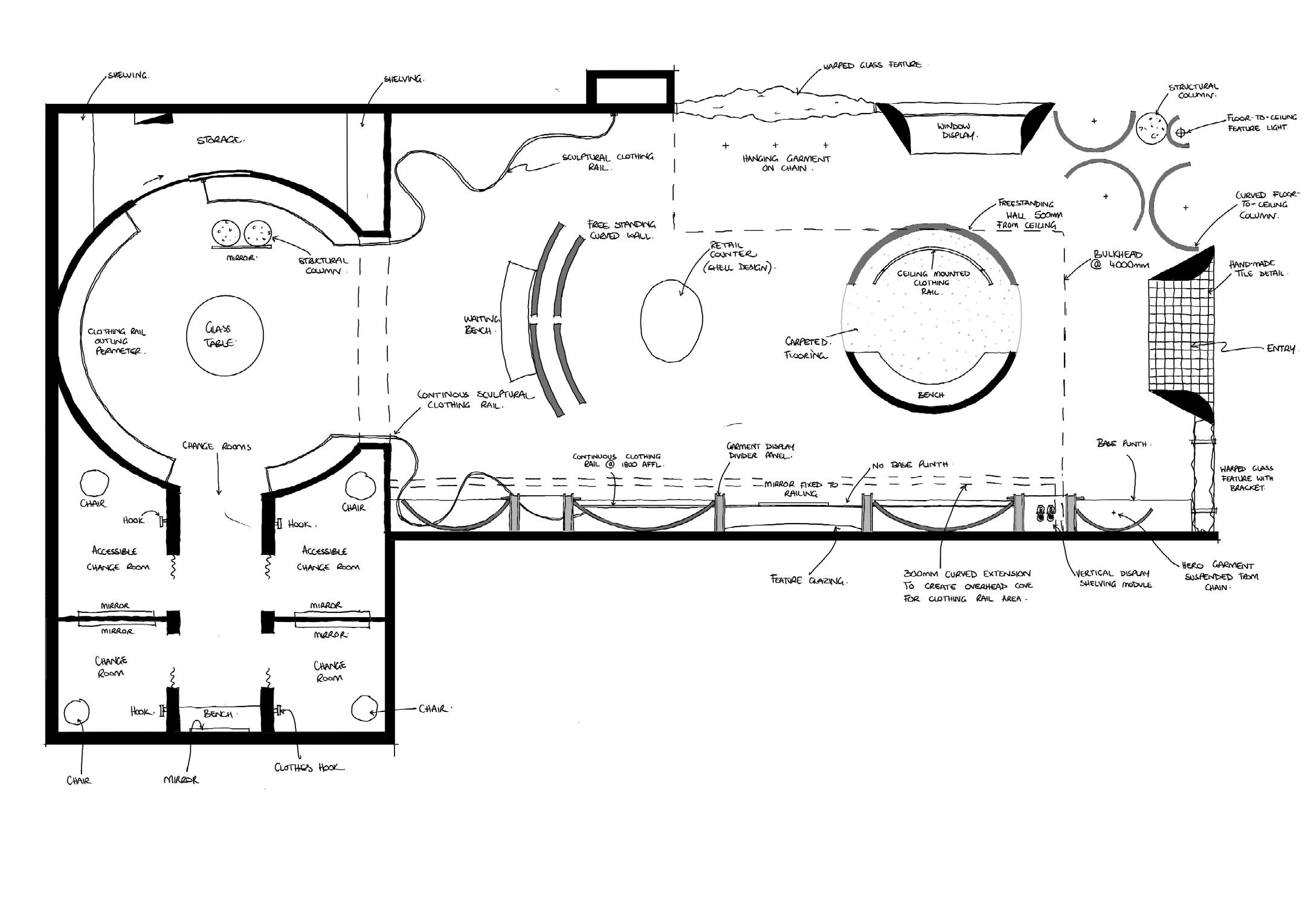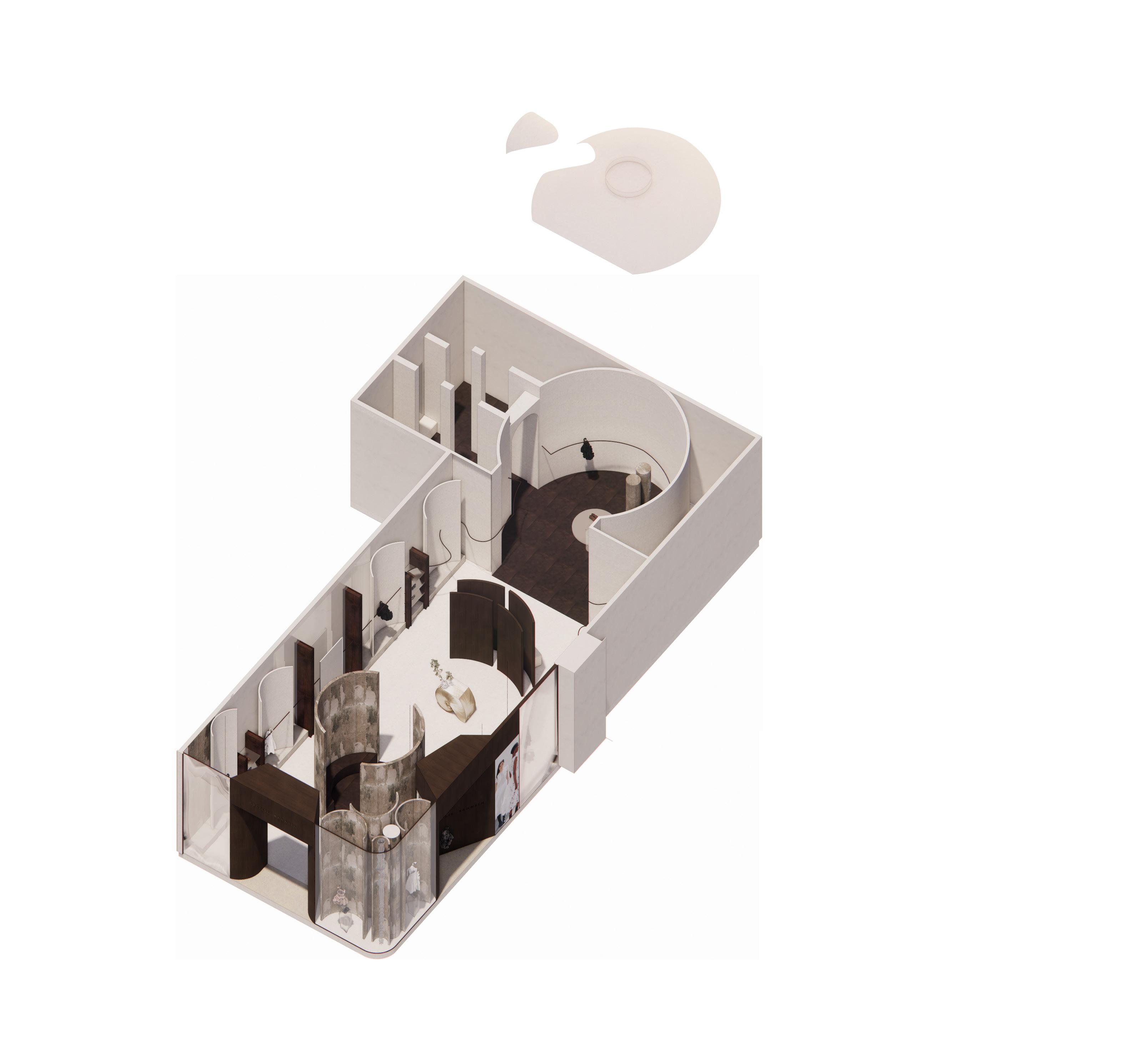 The flagship translates the established spatial language into a fully resolved retail environment. Clear sightlines link the entry to the curved alcove, shell-formed reception counter, sculptural partitions, and the domed reveal at the fitting rooms.