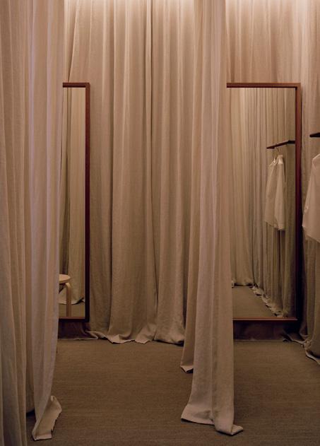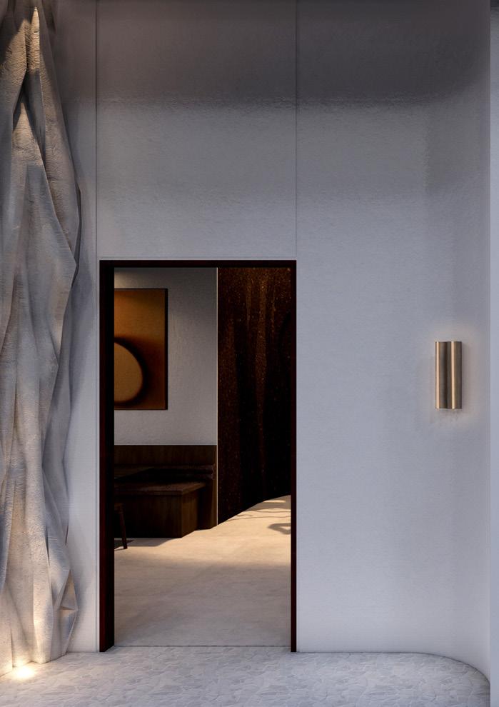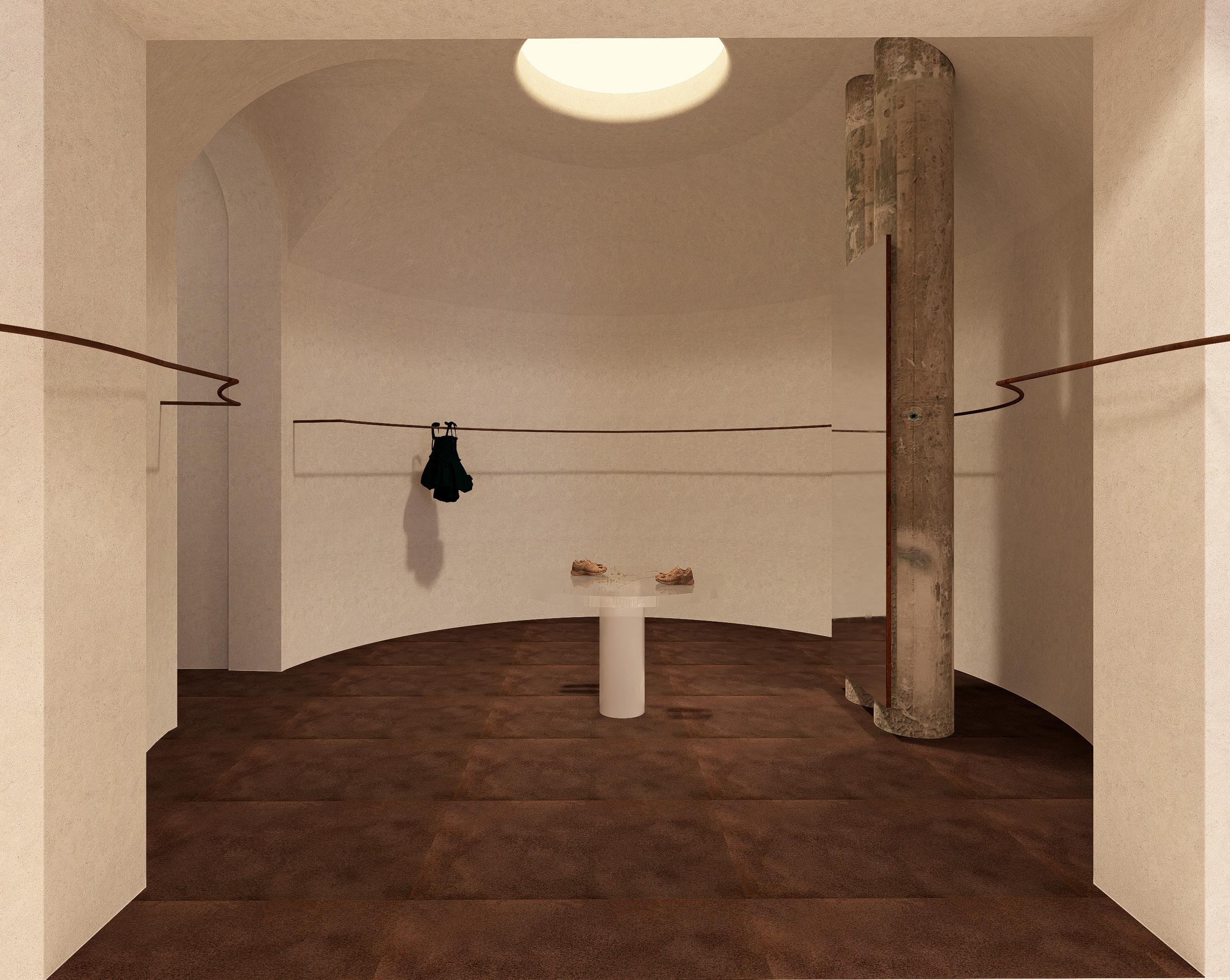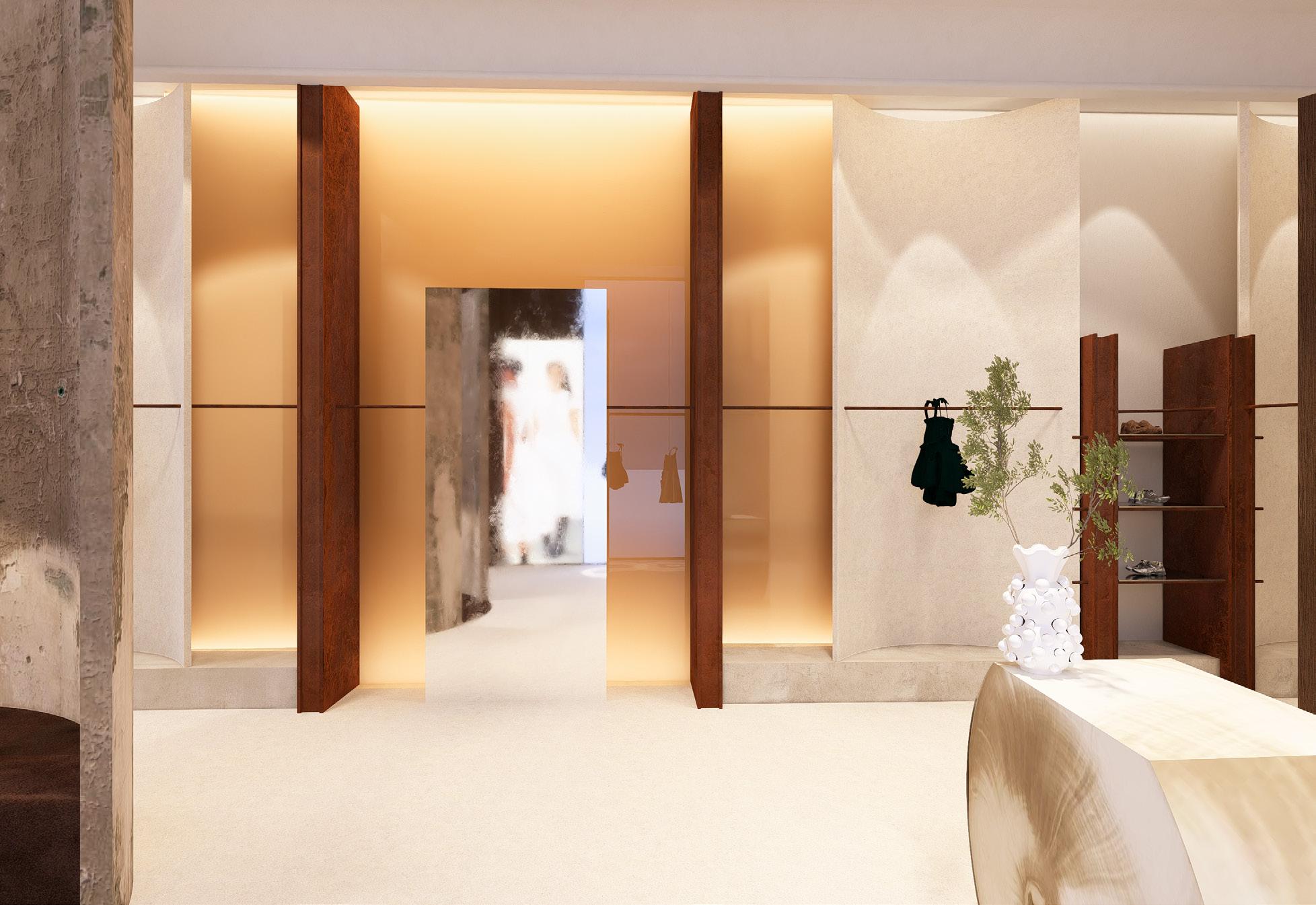 Phase II develops the concept into a permanent retail environment that balances Bahnsen’s delicacy with a more sculptural, brutalist material language. The single concrete extrusion explored in the pop-up becomes a series of curved half-cylinders, opening clearer sightlines into the store while retaining the brand’s signature silhouette-driven geometry Subtle floral shadows beneath the garments continue the motif in an understated way, allowing the clothing to remain the focus. Inside, a floor-to-ceiling glowing glass wall introduces a sense of softness and lightness, creating a luminous backdrop for the collection. Branding is integrated directly into the architectureembossed in concrete and cut into corten-like doors so that the warm glow illuminates the identity as the store transitions from open to closed. This phase refines the concept into a calm, sculptural and enduring spatial expression.