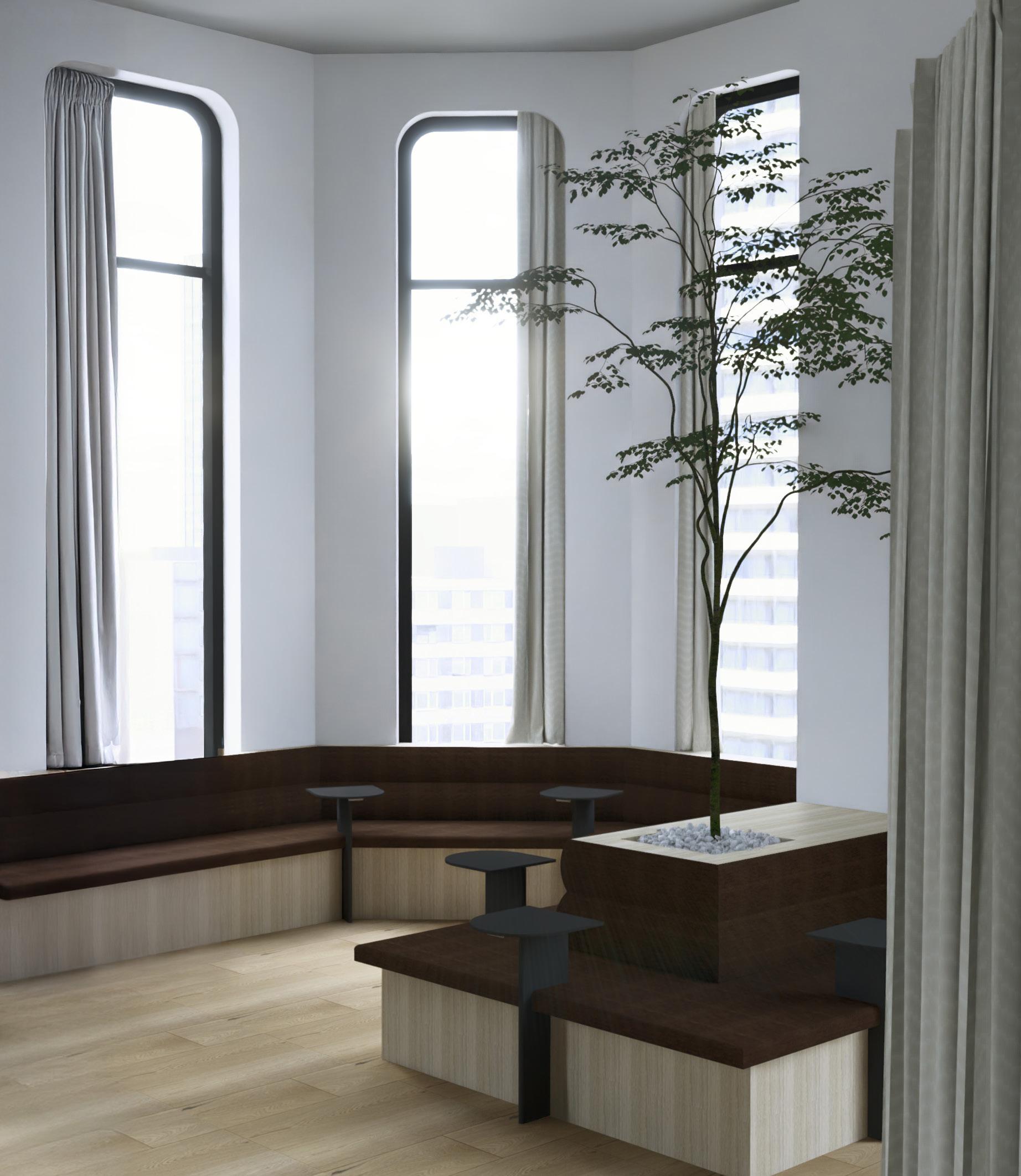Forma Terra brings a grounded and textural identity to Electric Lane. Natural materials such as rammed earth, carved stone, cork and wood create a calm and sculptural atmosphere.