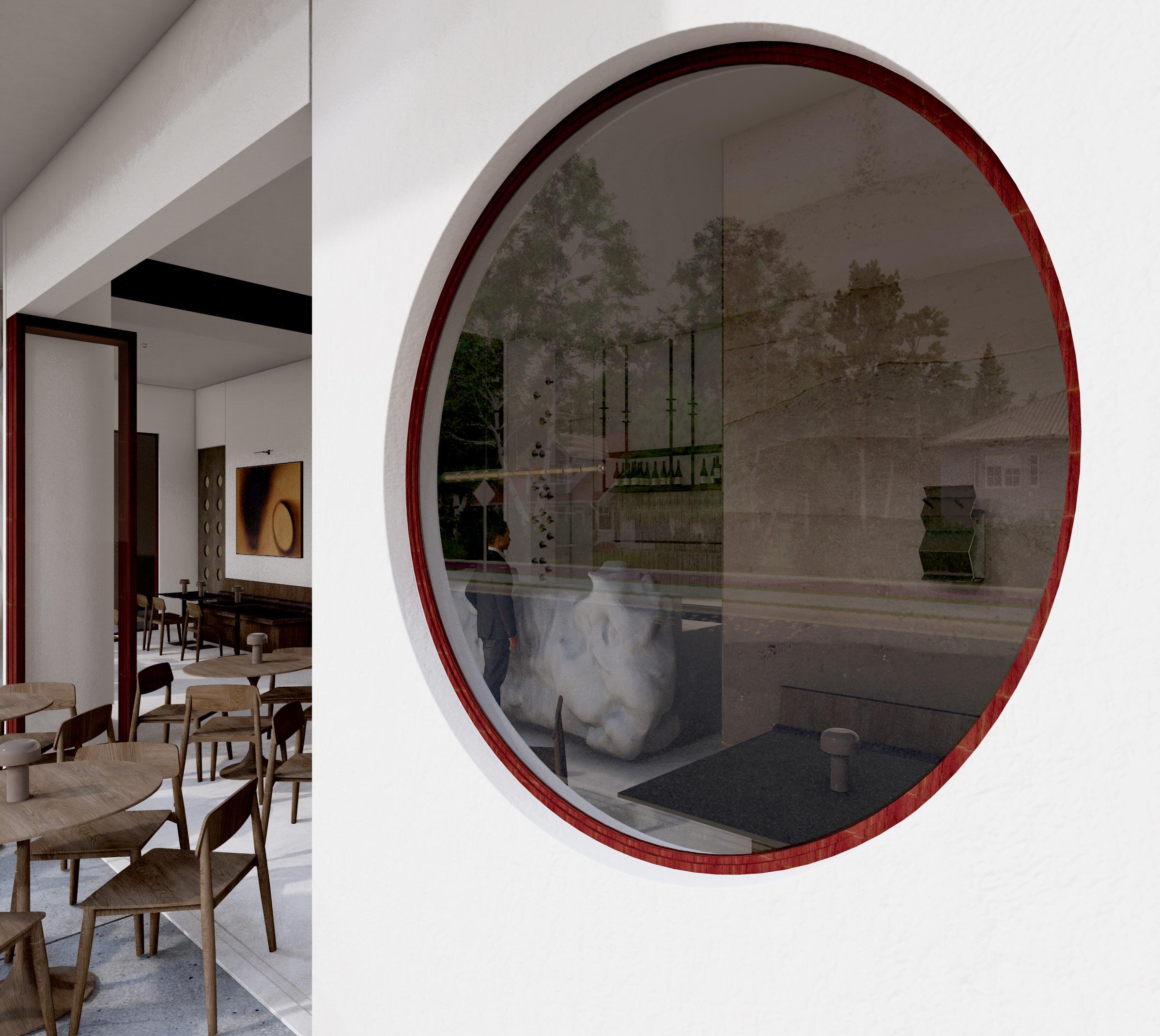 A framed view through the circular window reveals the spatial sequence of the bar, offering a quiet moment that connects the exterior to the interior.