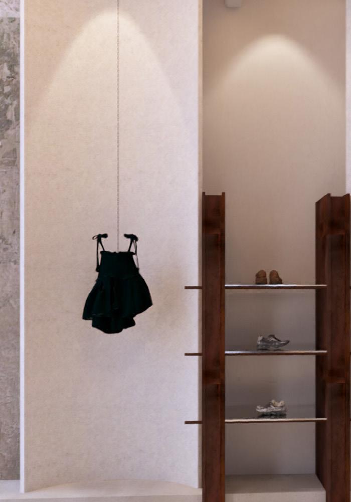 Material shifts—Micro-Cement walls, tinted-architectural glass, warm Corten accents, and deep brown carpet—define each zone and create a structured circulation path. Integrated lighting emphasises form and highlights key garments without overpowering the space.