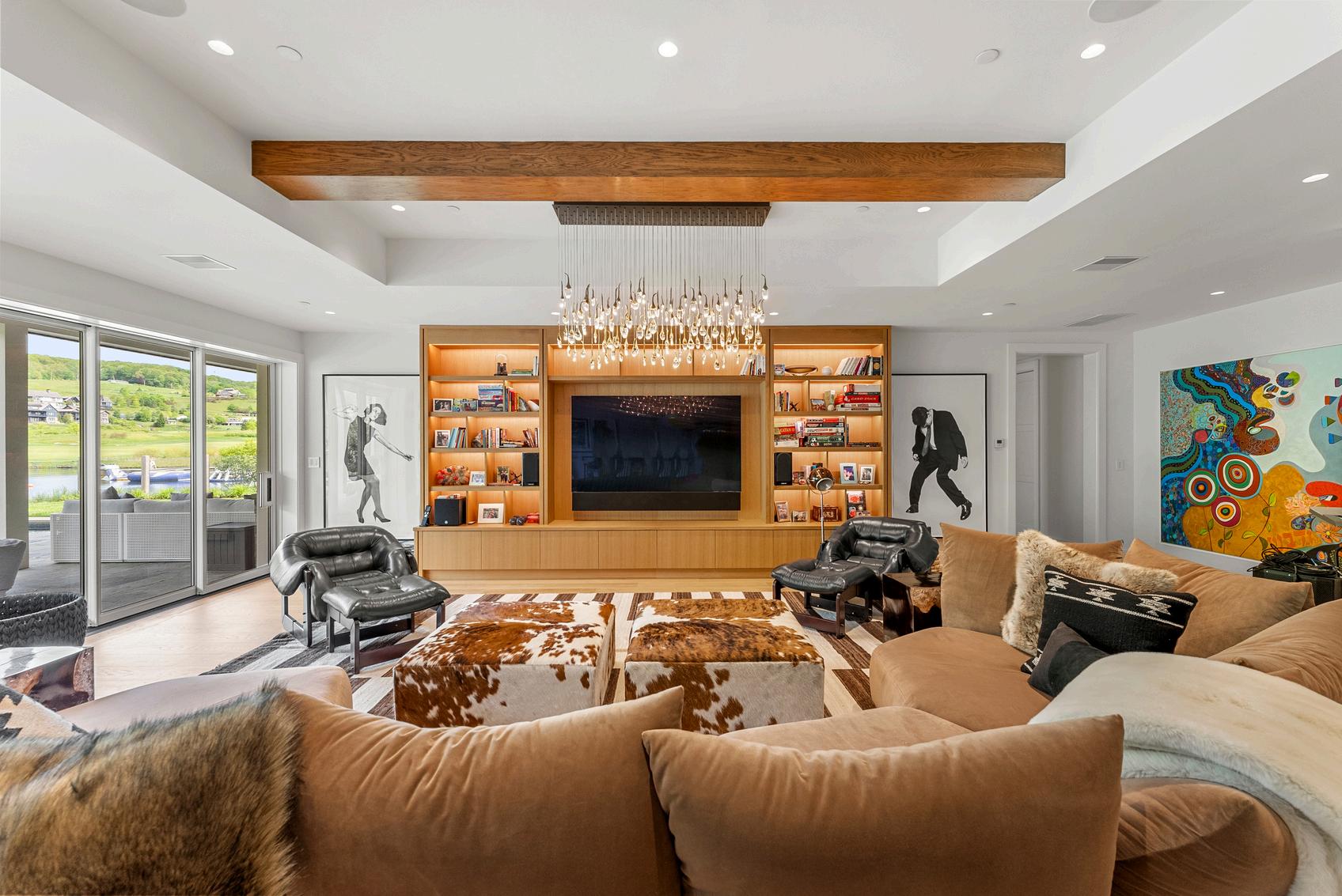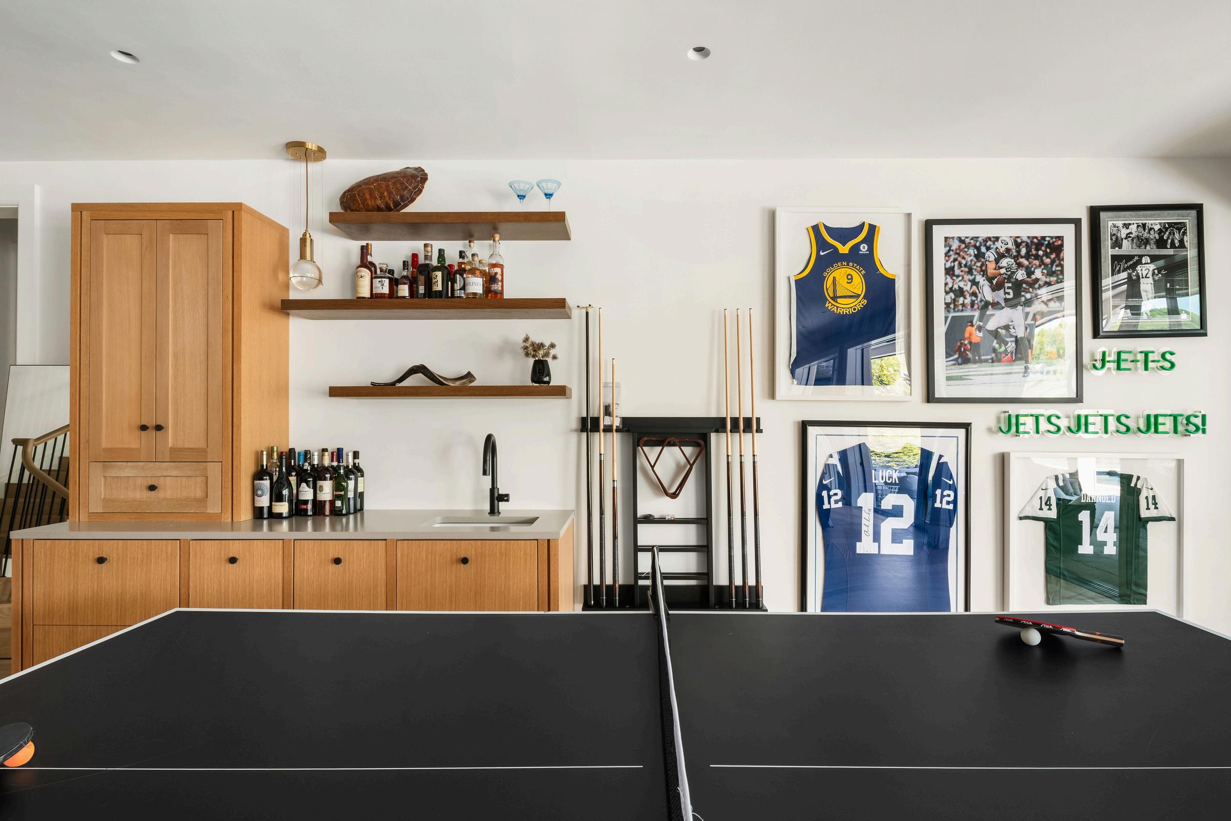 The lower-level family room is a standout space, with its white oak beamed ceilings and wide plank flooring adding a modern, airy vibe. Custom cabinetry complements the room ' s generous dimensions, offering plenty of space for family activities and play.