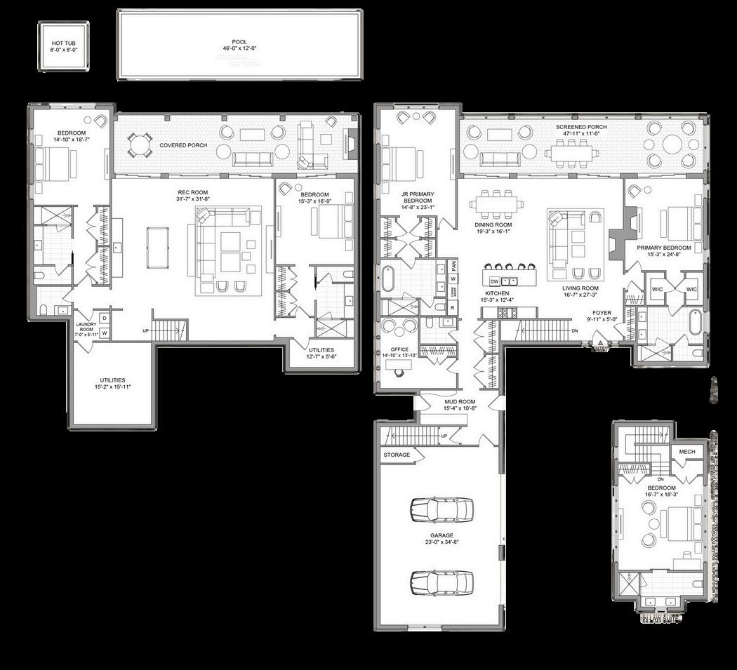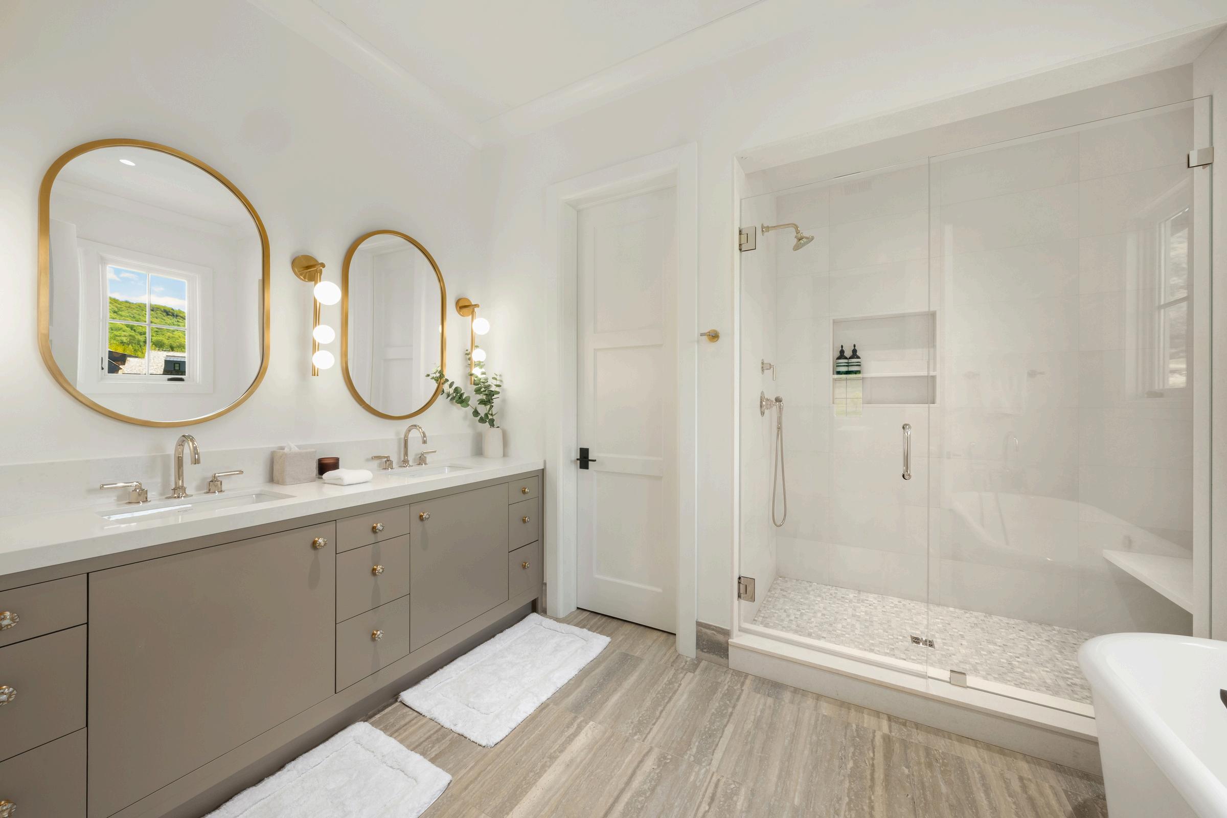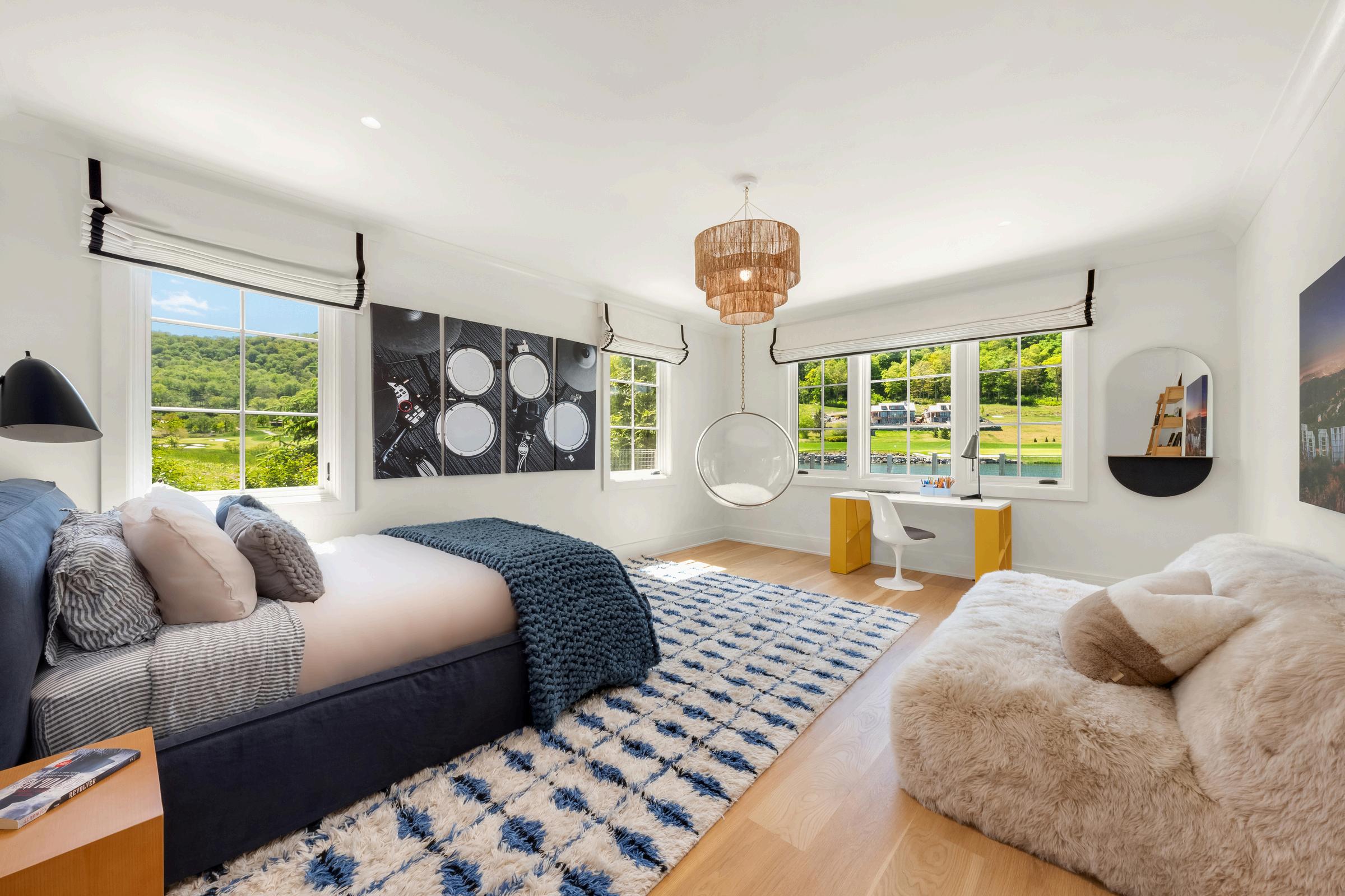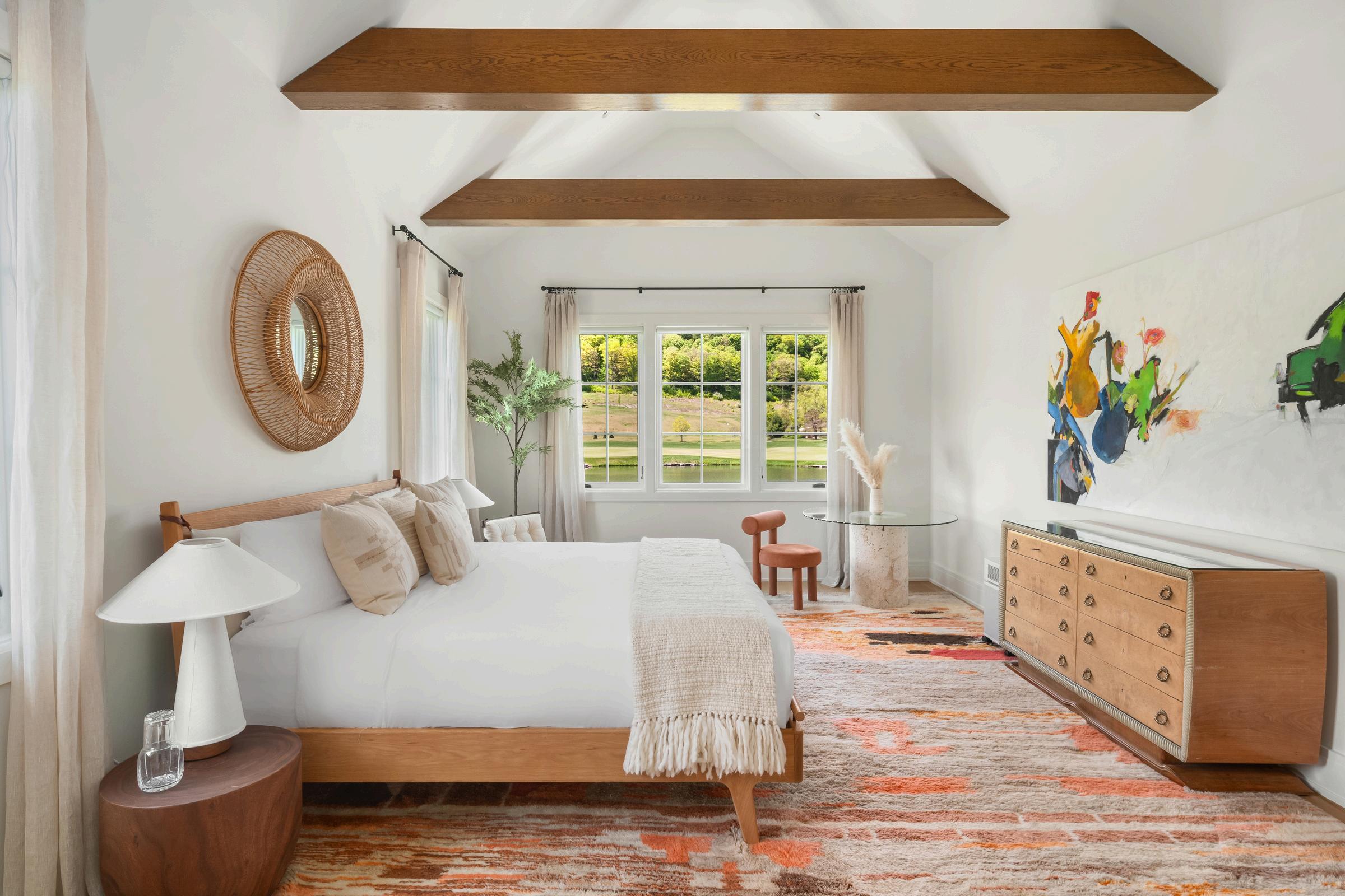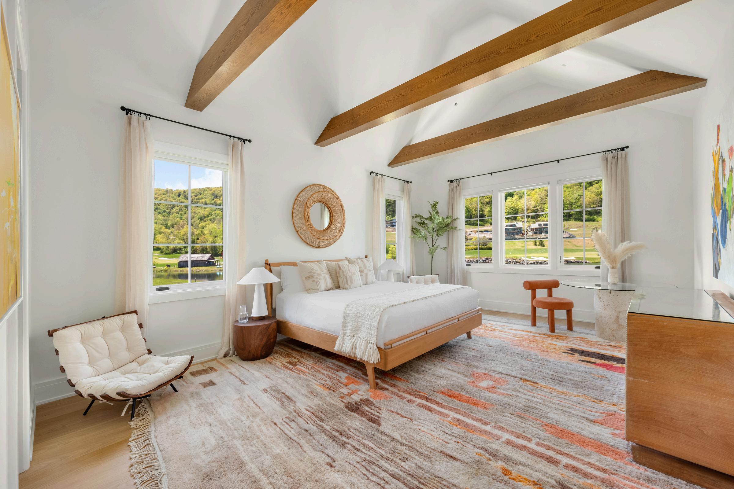 Located off the great room, guests can revel in the second primary suite’s double-height ceilings, wood beams, expansive layout and bespoke amenities.