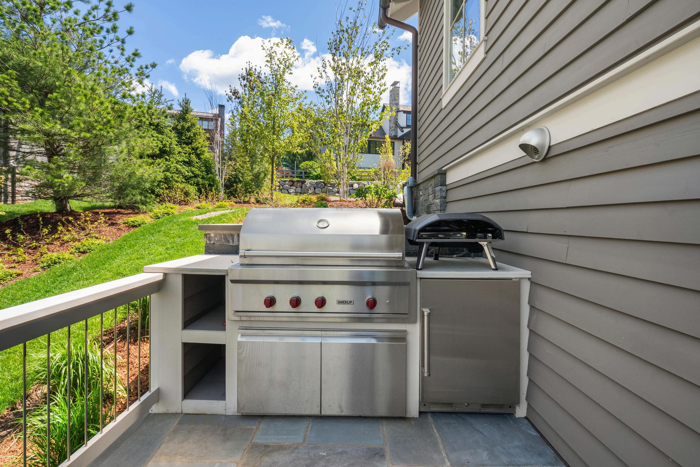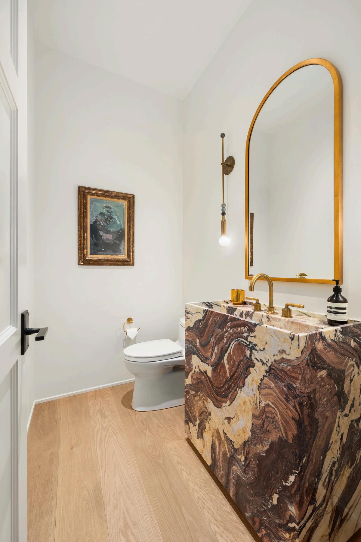 This bespoke house features the highest quality finishes and materials, including imported Italian marble countertops, backsplash, and waterfall island, as well as Sub-Zero and Wolf appliances, and Samuel Heath of England brass fittings.