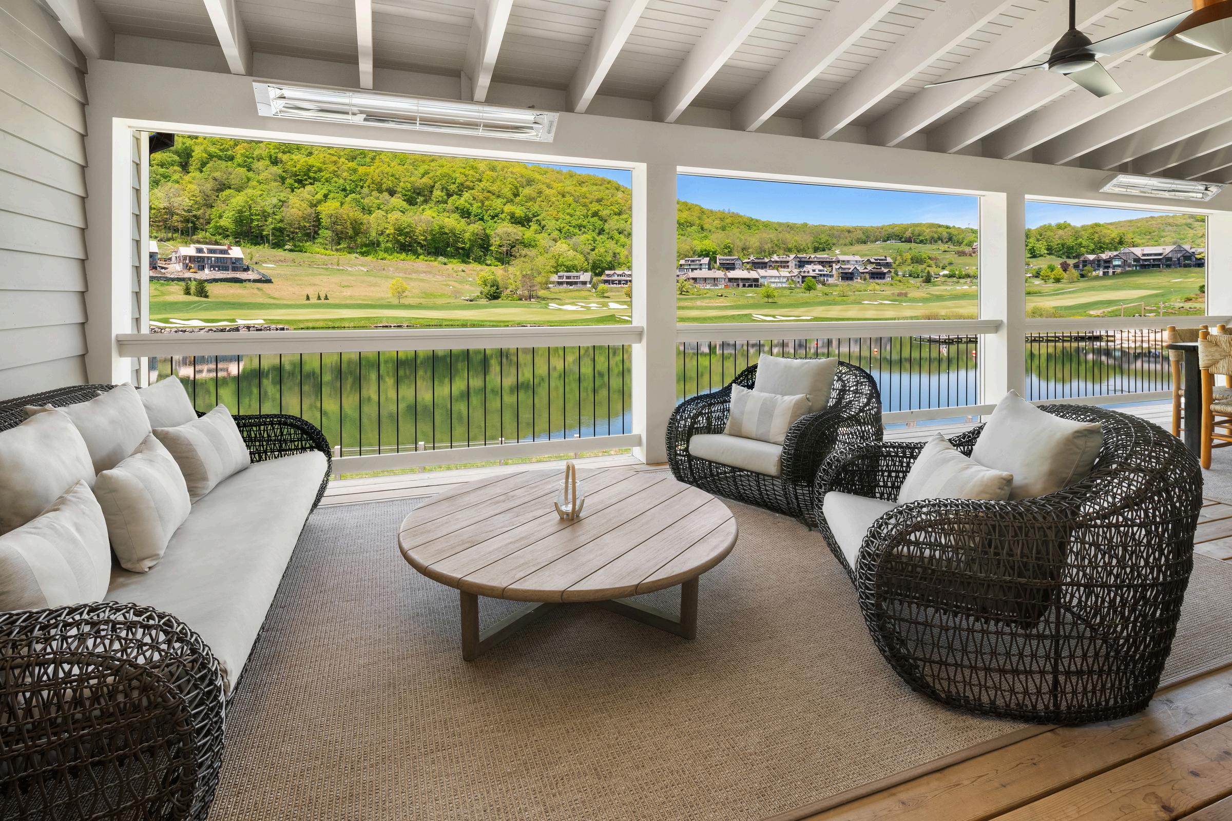 The stunning terrace, an expansion of the great room, effortlessly blends the indoors with the outdoors to enhance every gathering. Equipped with electric patio heaters, retractable screened-in porch walls, and outdoor surround sound, this space is perfect for both cozy conversations and open-air dining against the lake and verdant hillside.