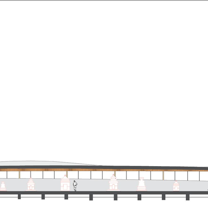 AFTER SEEING THE WALL-BASED ART, YOU MOVE INTO THE SHRINE ROOM ON THE SOUTHSIDE OF THE BUILDING. THIS AREA IS LARGE AND GETS THE MOST DIRECT SUNLIGHT. HERE, THERE IS SEATING AND PLENTY OF SPACE TO MOVE AROUND, OBSERVE, AND MEDITATE ON THE LARGE SHRINES. ALL AWHILE, THE CASCADING MOUNTAINS TOWER OUTSIDE. THIS MOMENT IS THE CLIMAX OF THE PROJECT. IN TERMS OF ELEVATION, IT IS THE HIGHEST MOMENT OF THE PROJECT, BUT IT IS ALSO THE WIDEST MOMENT IN THE RIBBON. AFTER THIS MOMENT OF PAUSE, YOU MOVE INTO A SECTION FOR LOCAL ART, WHERE YOU CAN EXPERIENCE THE ART OF NAAR. NEXT, IS A LONG STRETCHING TABLE FULL OF NEPAL’S POTTERY HERITAGE. IT’S IN THIS SPACE THAT THE SLOPING FLOOR HAS BEGUN TAKING YOU BELOW GROUND.