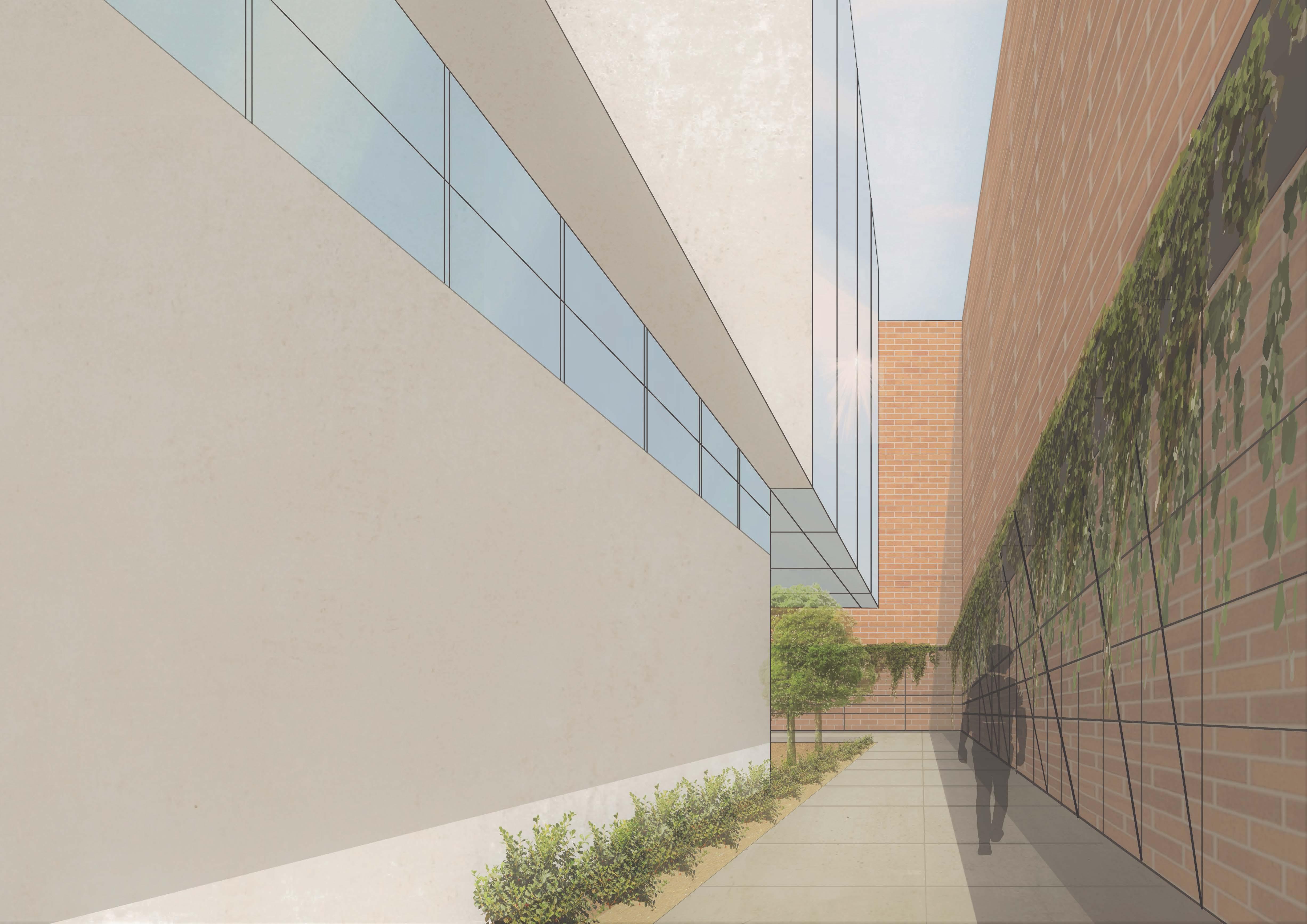 the alley context is the tightest and hardest ot work with of the three sites. The space is currently an alley between three buildings. In order to make this space feel less entrapping, voids pierce the building and allow light and green space to come in. the sections also show how green space exists on the buildings exterior. the render gives a first person view of the buildings entry sequence and how even such a tight space can be light and open.