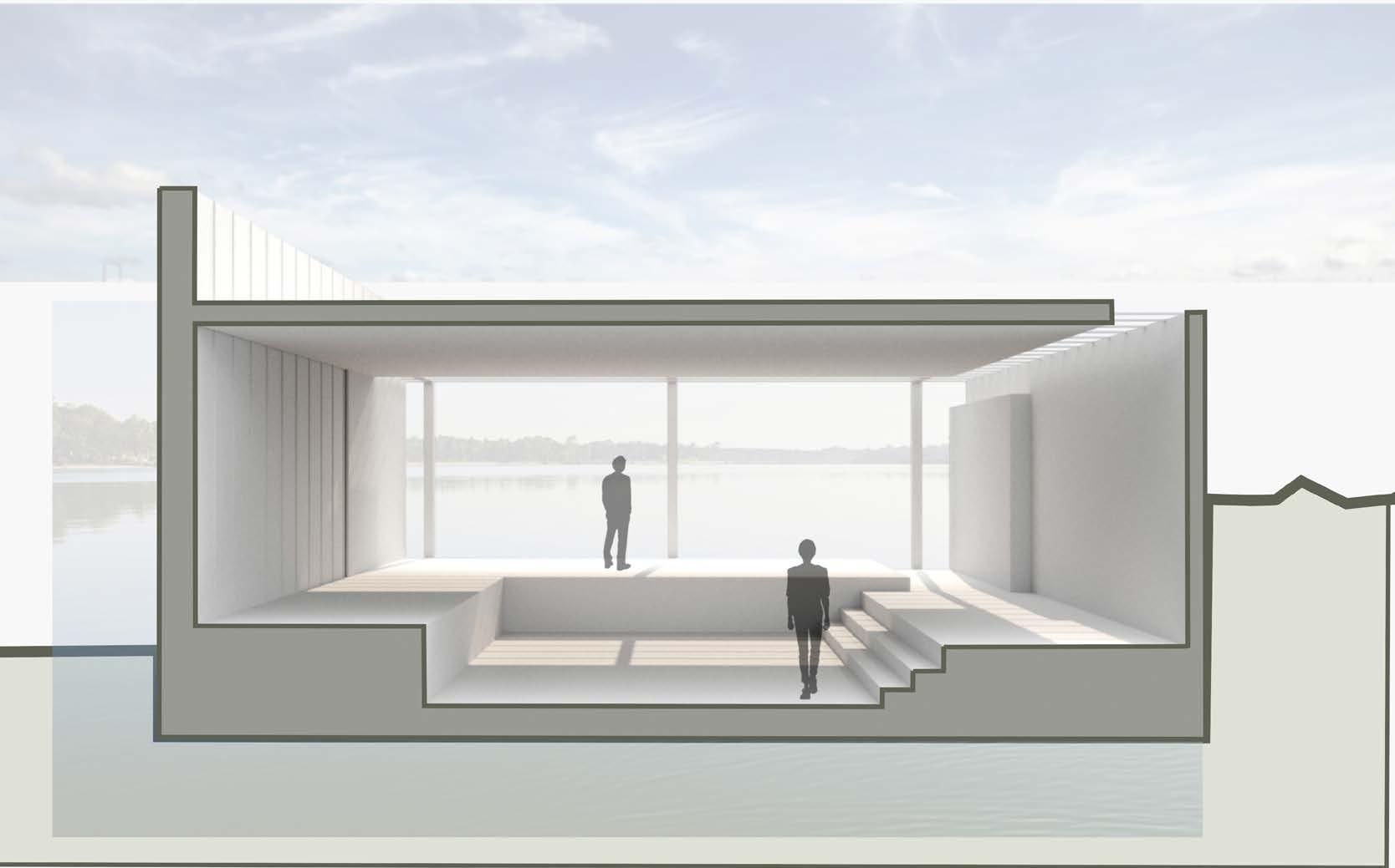 The performing arts space shows upon upon entry to the building from the outdoor pavillion. The render shows how the space frames a view of the river as the back drop for the performing arts. People can sit and watch as dancer’s sillhouettes float across the glassy water behind them. The outdoor pavillion also casts a beautiful light condition into the space.