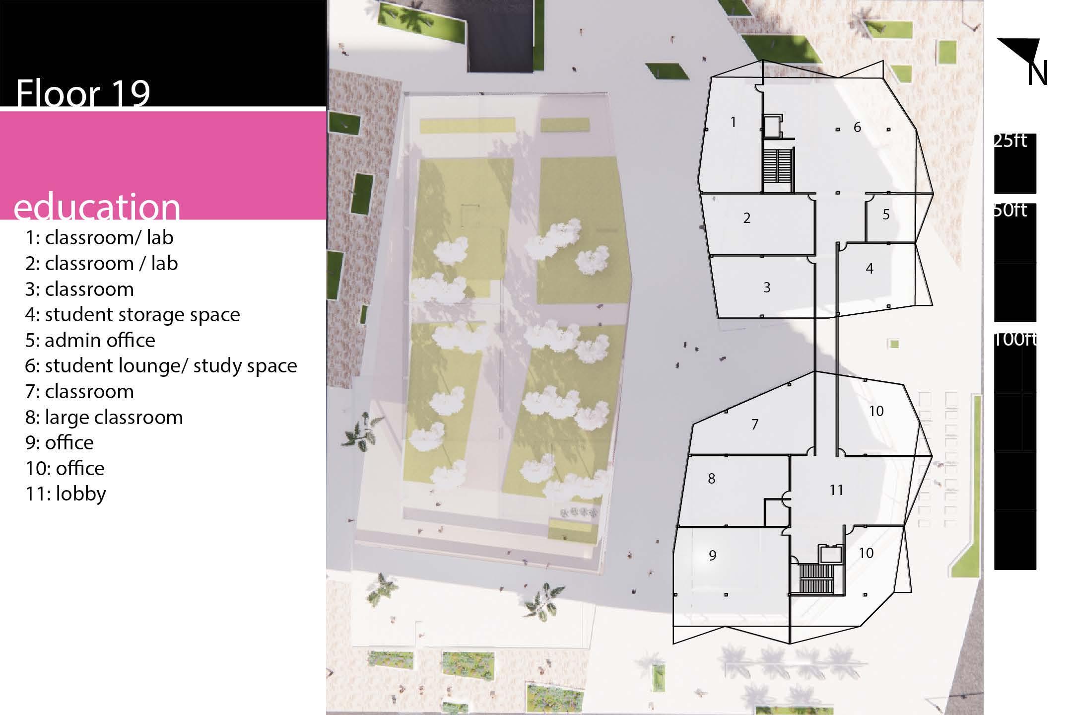 Education Programs were placed at the top of the tower to provide a premium and serene experience for the students of the tower, rather than reserving this space for high income residential spaces. However, students are found to study better with the presence of greenery.