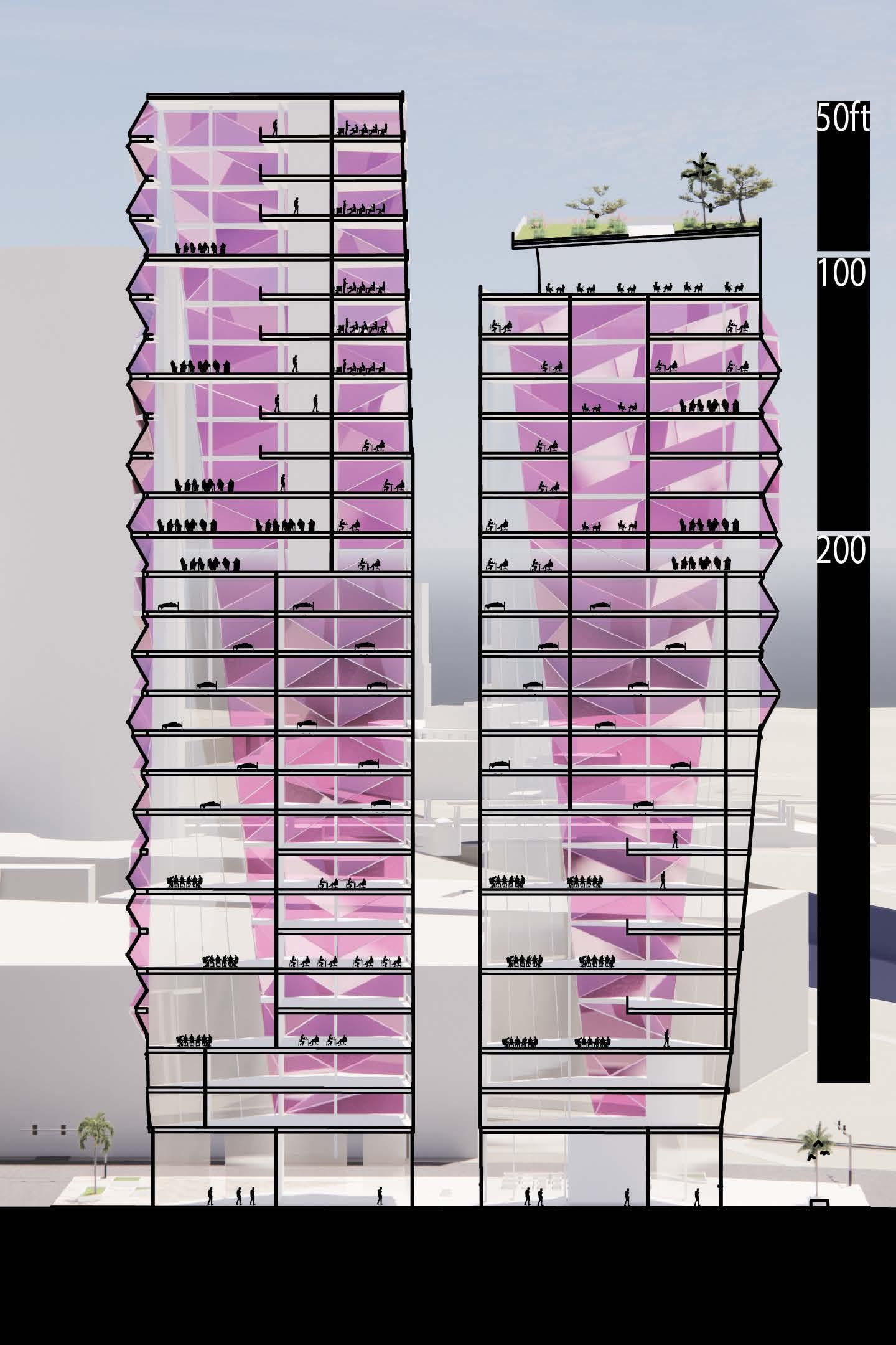 The towers involve several programs including education, residential, business offices, and a street level series of stores and restaruants. The building has a rooftop garden which supports the education programs located at the top. The sections also show how the skin moves across the building and the spacial experience it creates.