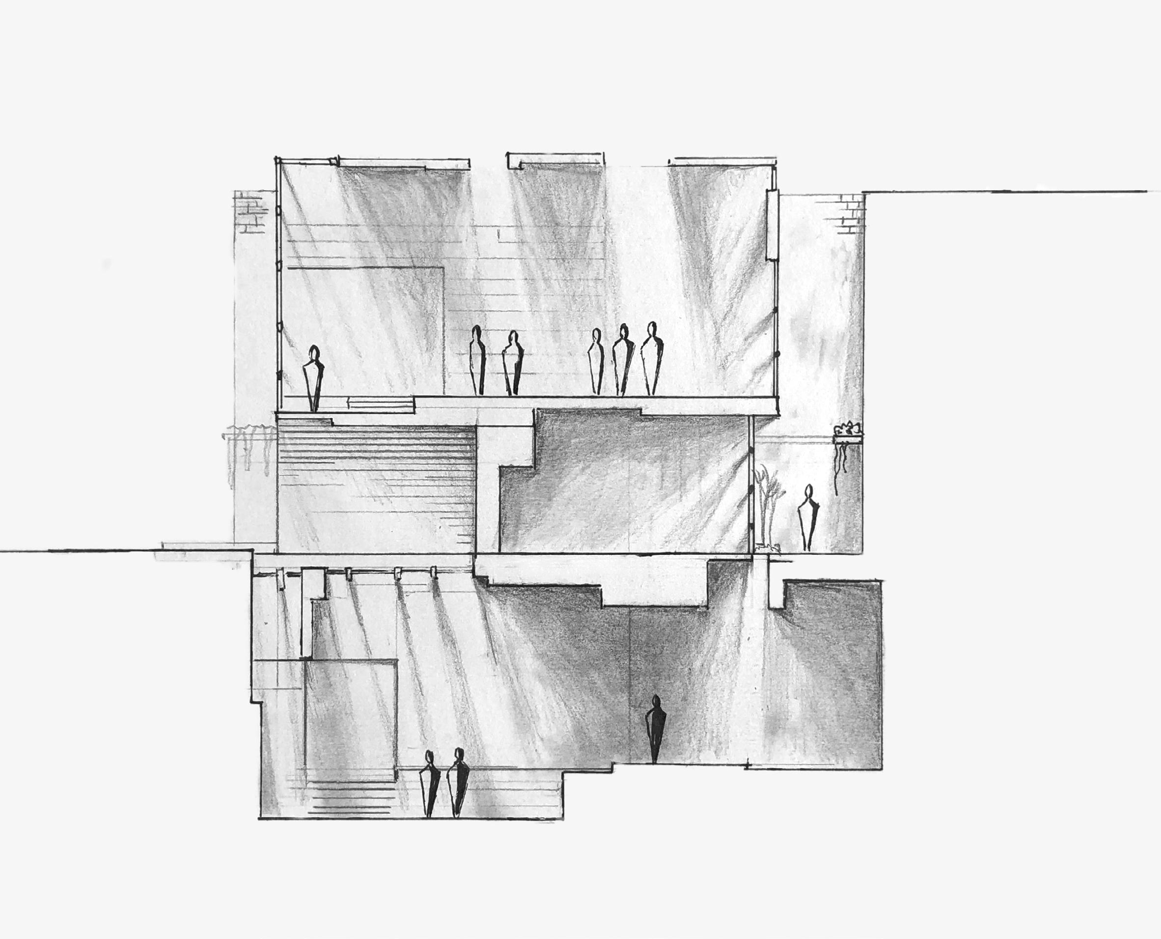 The sections show an underground student lounge with openings that still allow for natural ight. The event space is on the second floor, with classrooms on the ground floor. the lobby space has a tree and greenery that pertrudes into the space while being kept outside behind glass. This allows nature to be brought into the space, even in such a tight context.