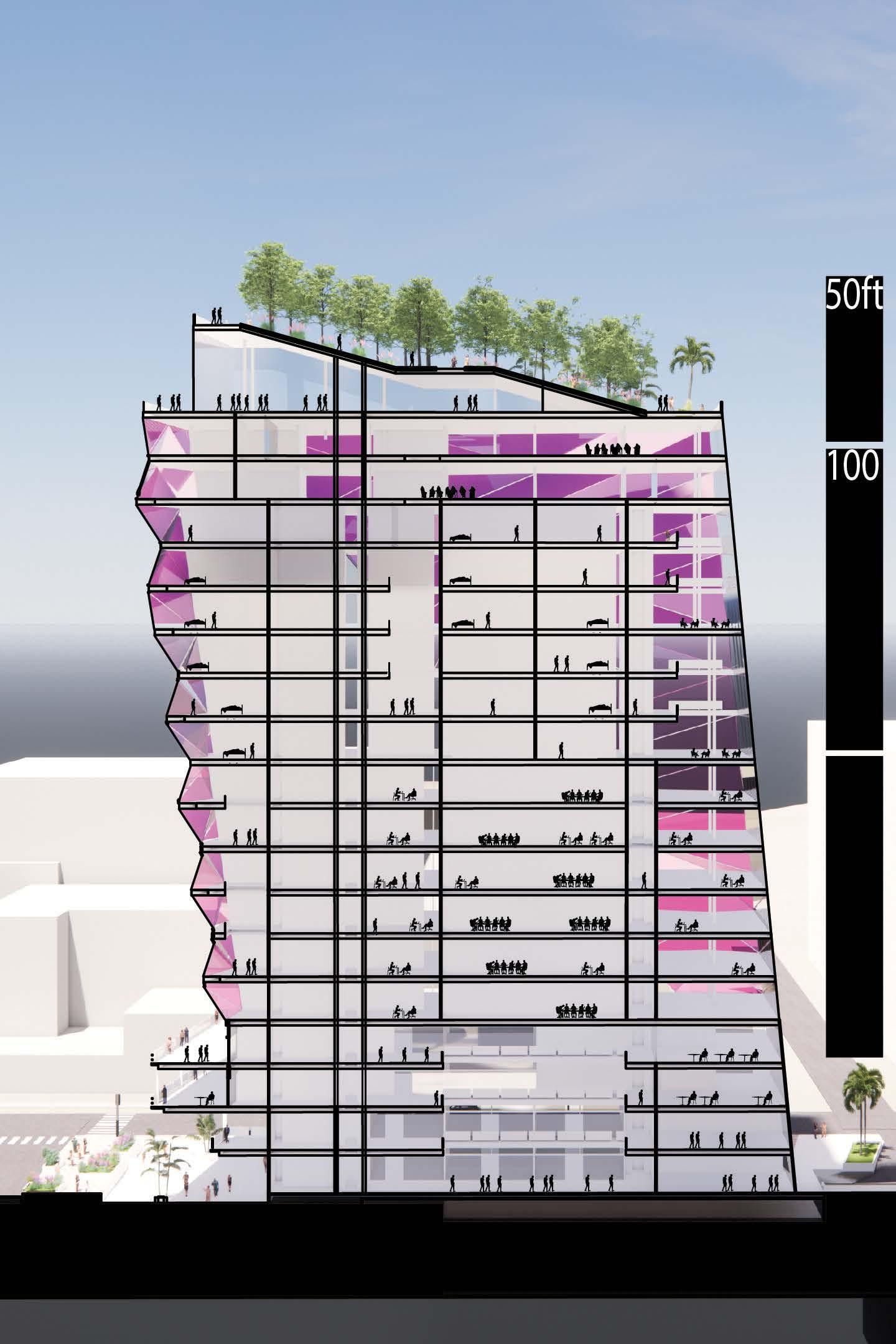 The programs here is living spaces for the culinary students, as well as three small rooftop gardens and a street level lobby.